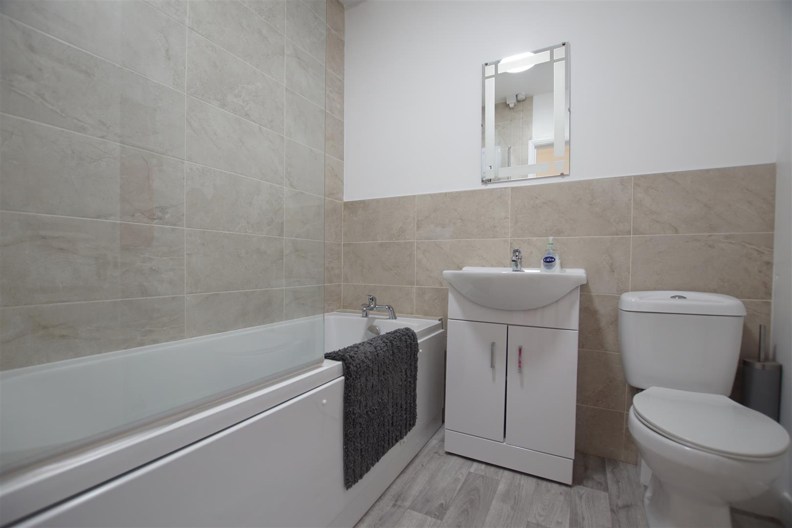 The beautiful bathroom has a white suite of panelled bath having a Triton adjustable shower over, Wash hand basin with double door cupboard beneath, and low-level WC, radiator extractor fan and large tiled areas.