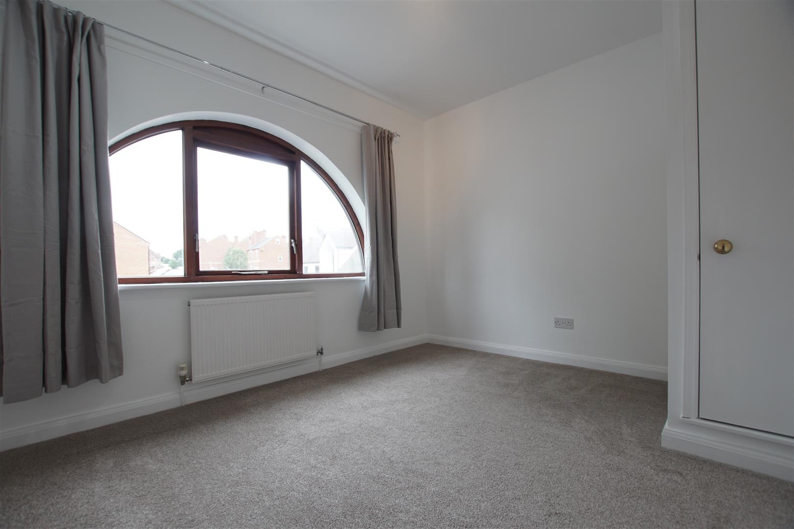 A double having, carpet, radiator and feature double glazed arched window and door opening to slim storage cupboard