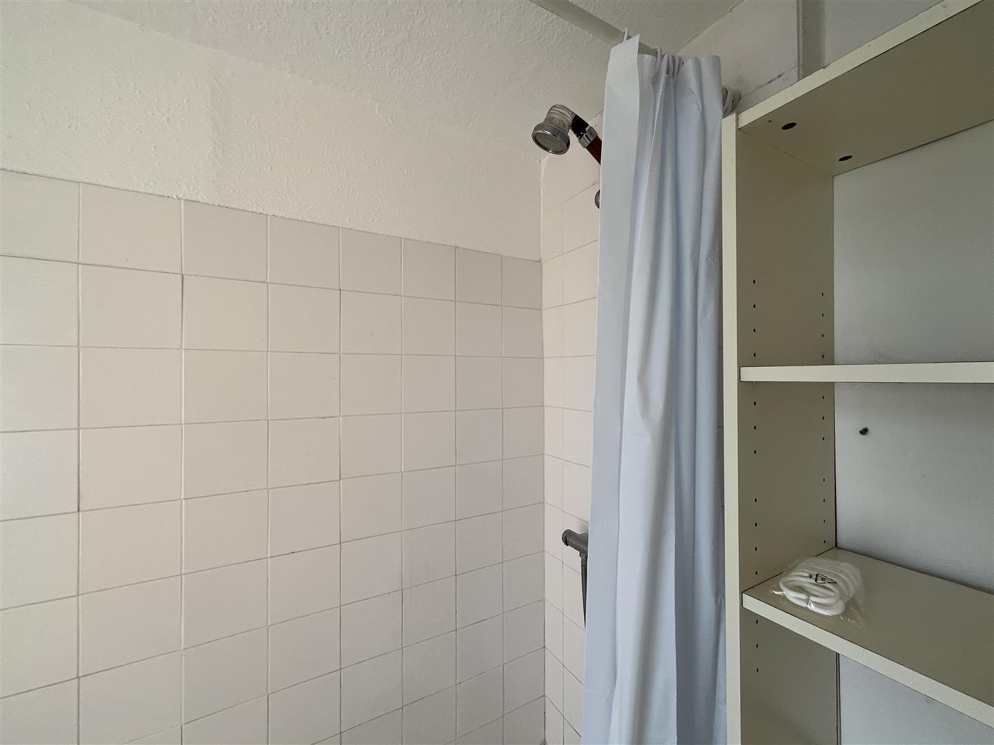 white suite with shower over the bath, w/c and wash hand basin and shelving unit.