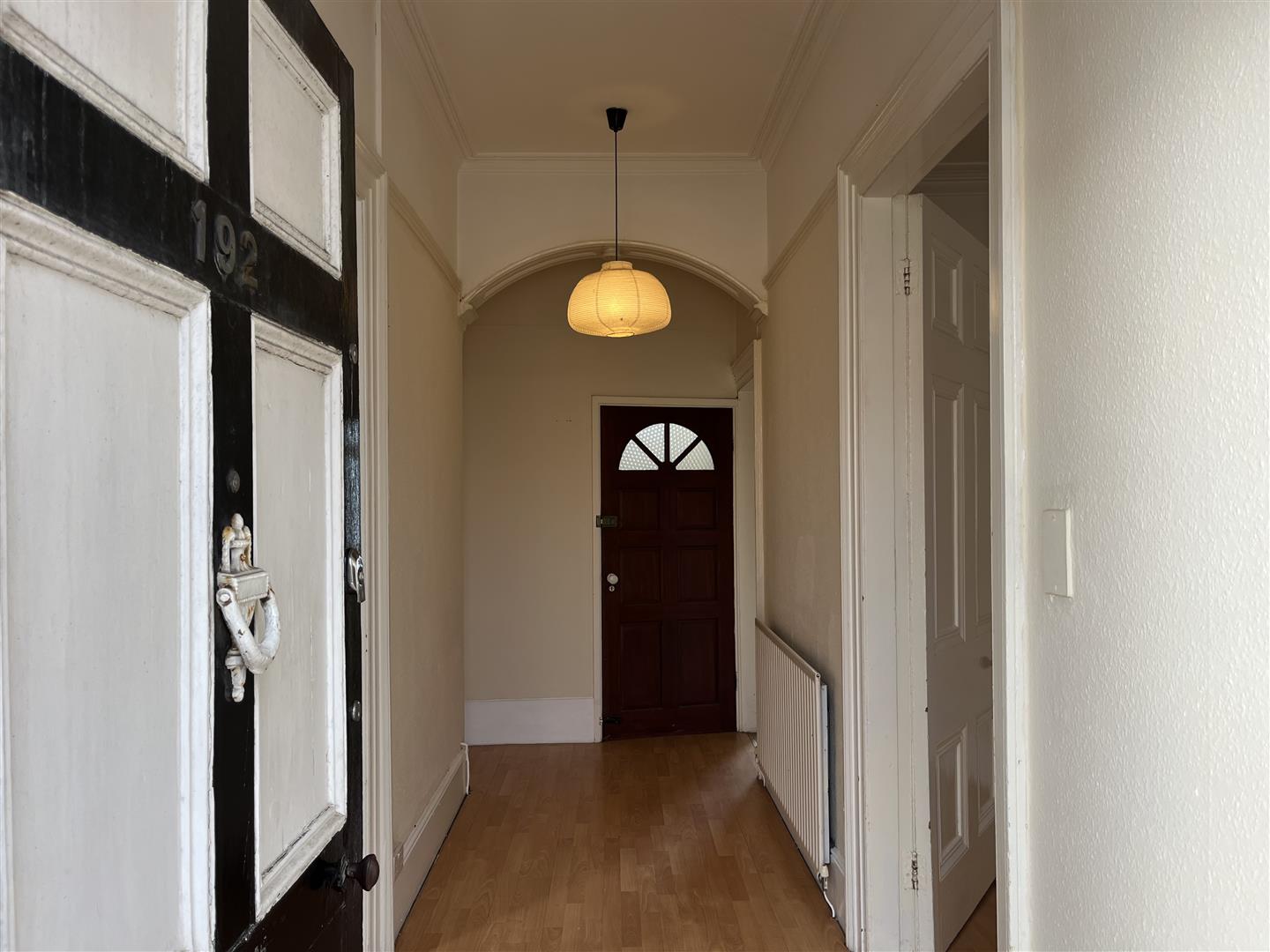 to the front of the property with high ceilings,  laminate flooring and radiator.