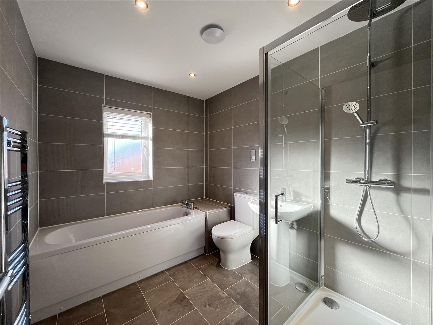The large spacious four piece family bathroom has a white suite with panel, bathroom, low-level WC, wash hand, basin, shower cubicle with rain shower and handheld adjustable shower, heated towel rail.