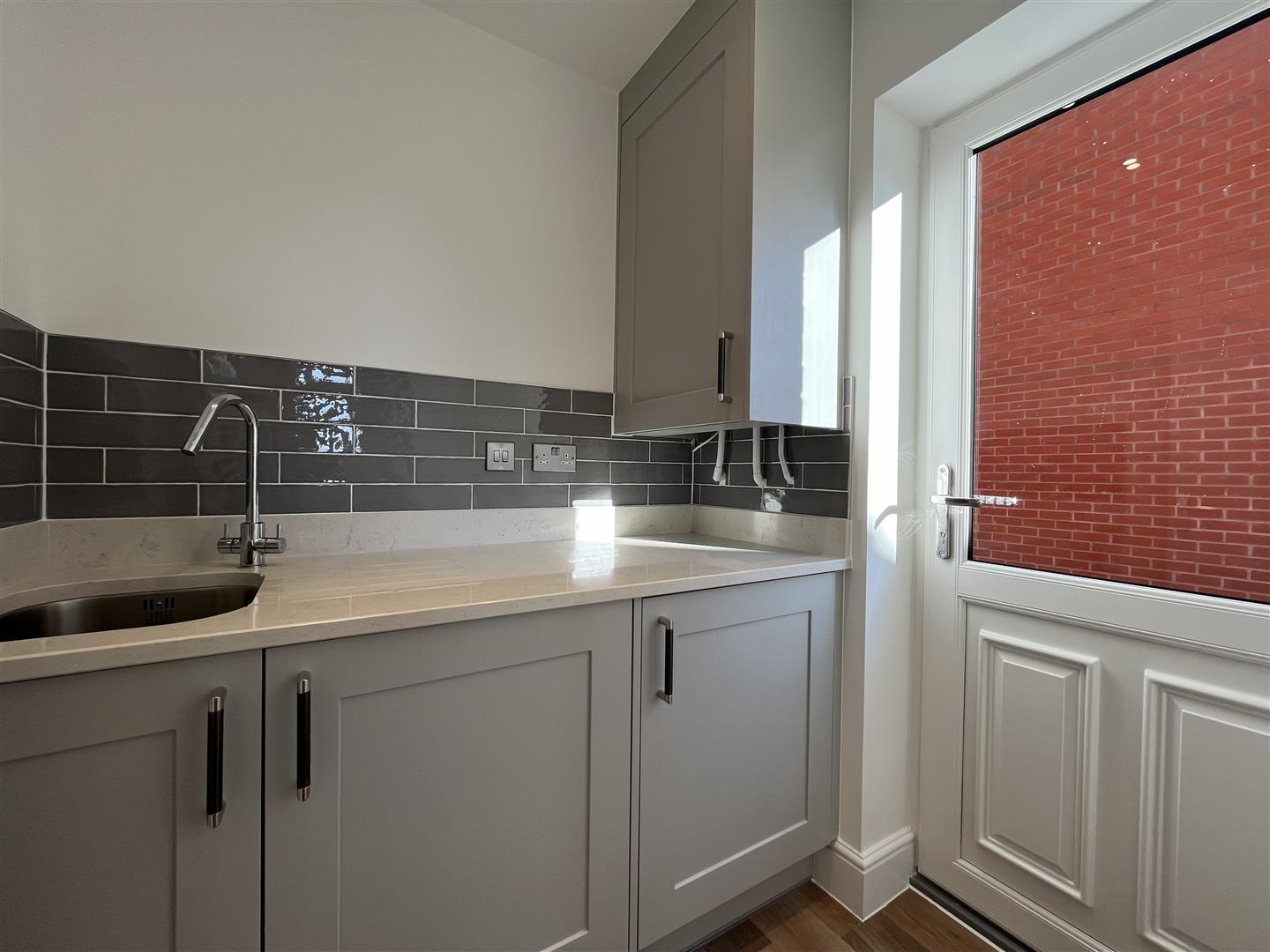 Attractive utility room with units to match the kitchen, having work surfacing with small sink and mixer tap, cupboards beneath housing the Zanussi washing machine, wall mounted cupboard housing the Worcester gas fired central heating boiler. External door to the side of the property and extractor fan.