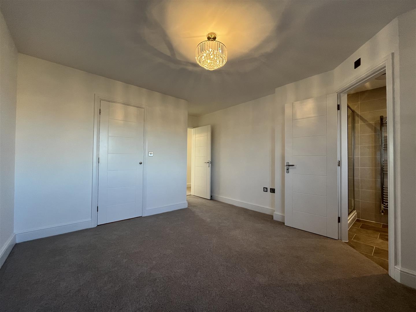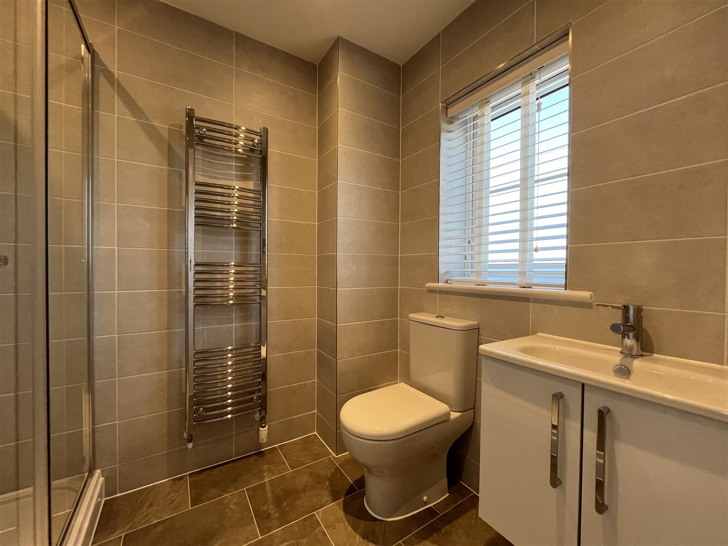 En-suite shower room with double shower cubicle, wash and basin and low-level WC and heated towel rail, shaver point, large tiled areas and obscured double glazed window.