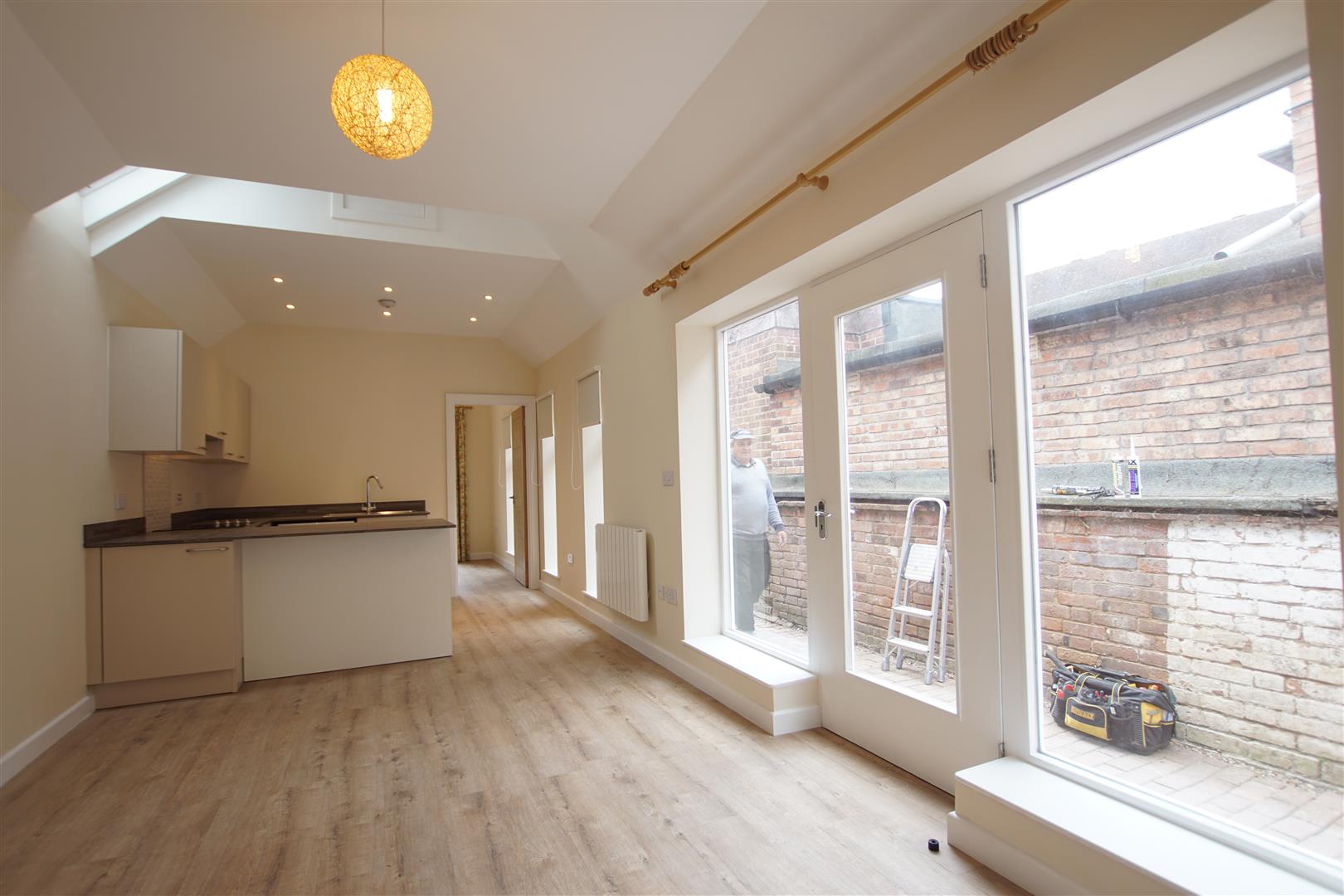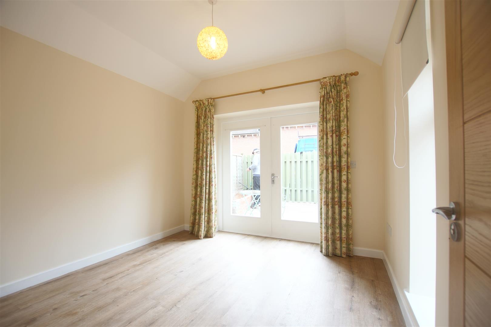 Double with Camaro wood effect flooring and double doors leading to the patio