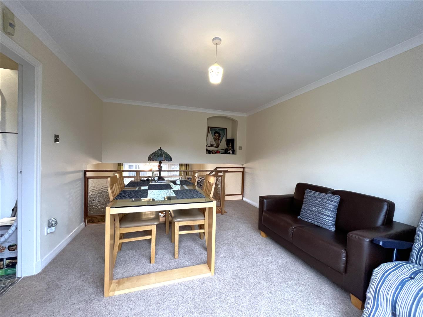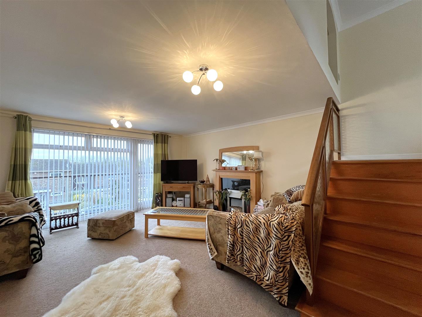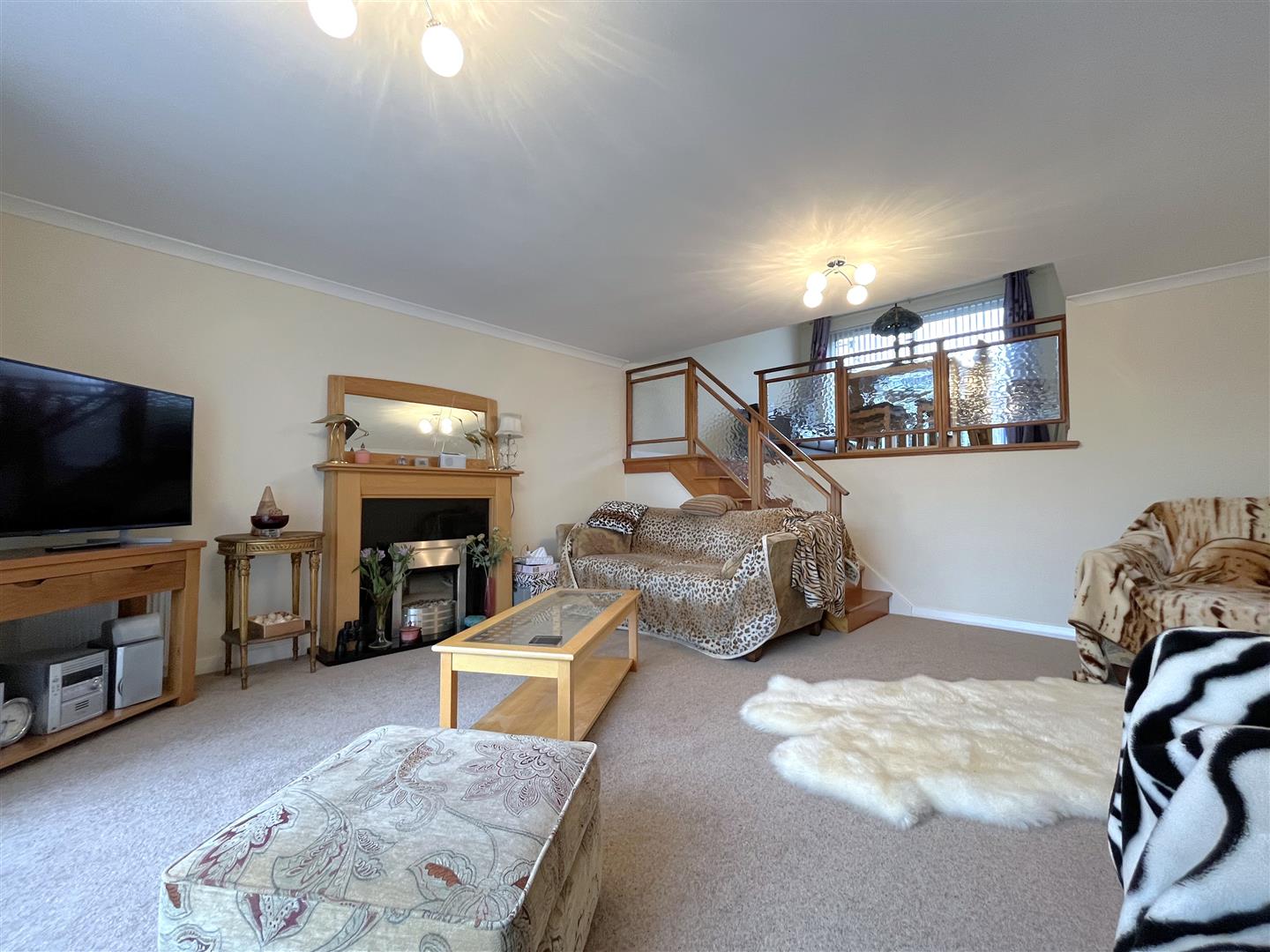 bright room with access to balcony via patio doors, neutral carpet, furniture to include: 3 piece suite with sofa, two arm chairs and matching foot stool, solid pine tv stand, coffee table. Gas fire with pine fireplace and wooden staircase leading to a separate mezzanine dining area leading to the Kitchen.