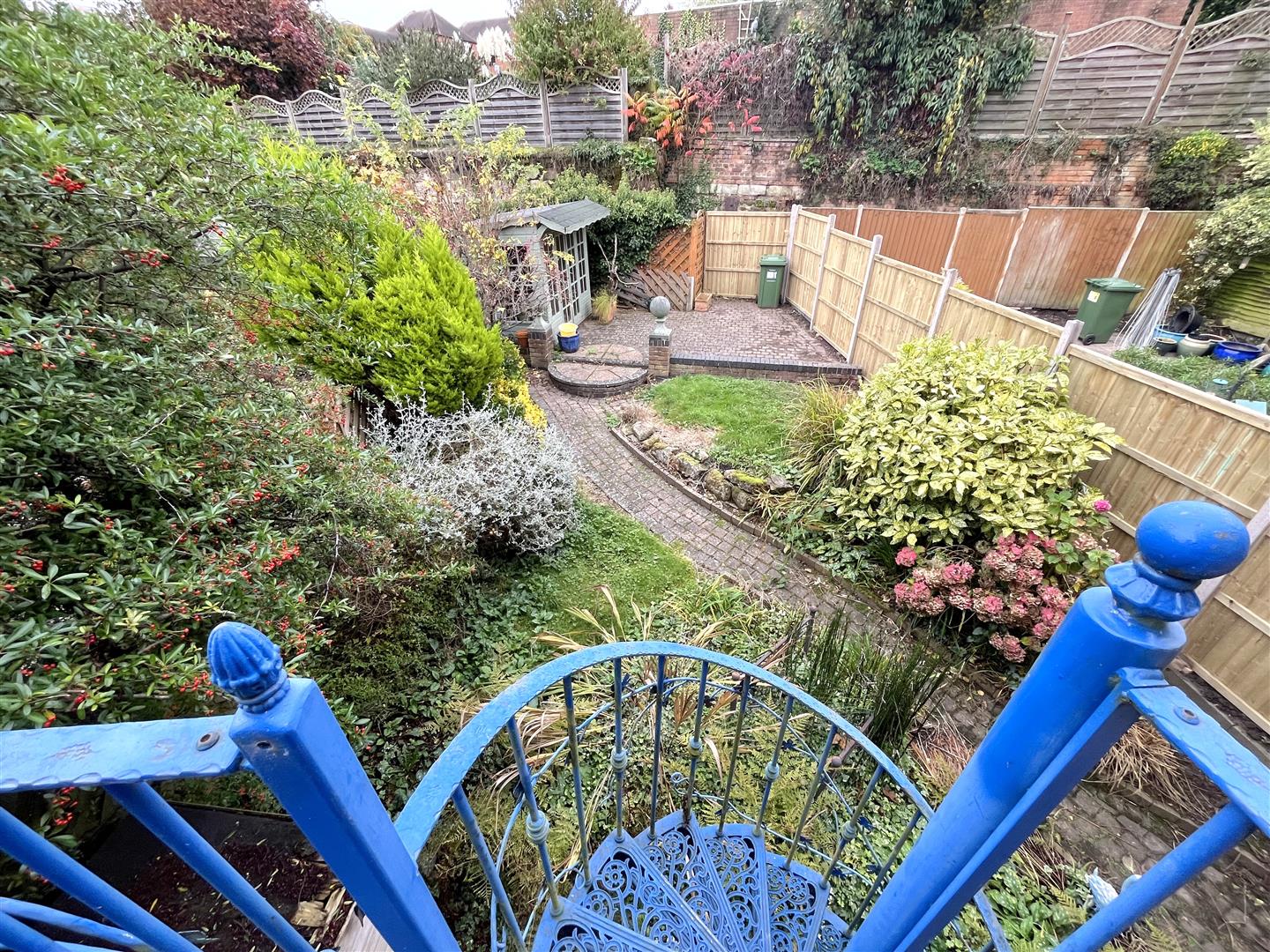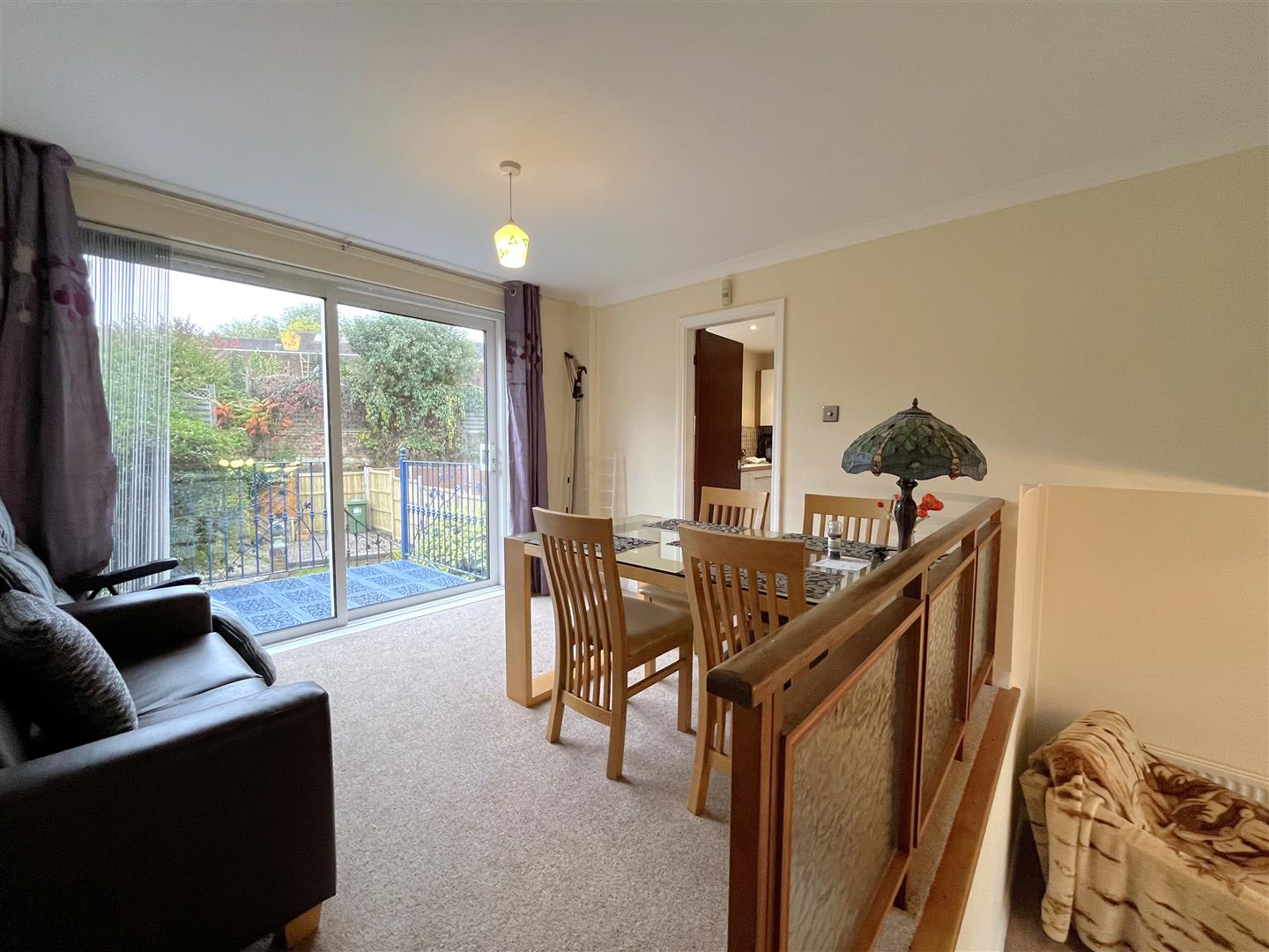 overlooking lounge with wooden dining table and 4 chairs, a two seater leather style sofa, and patio doors leading to a small raised patio area and a spiral metal staircase leading to the garden.