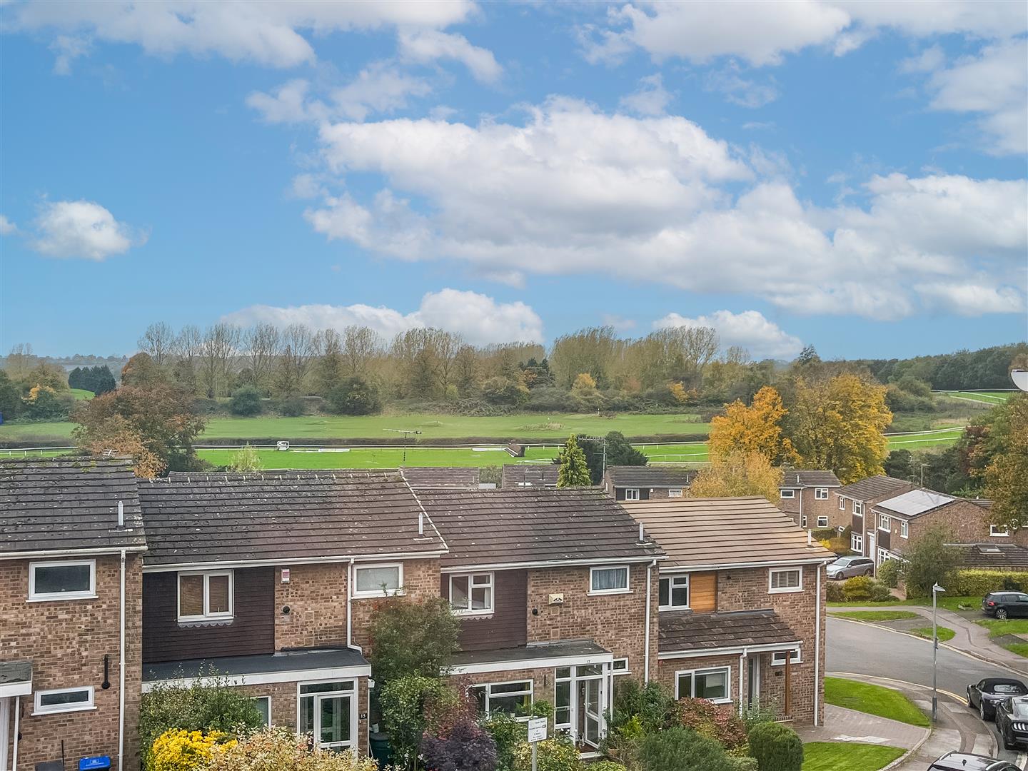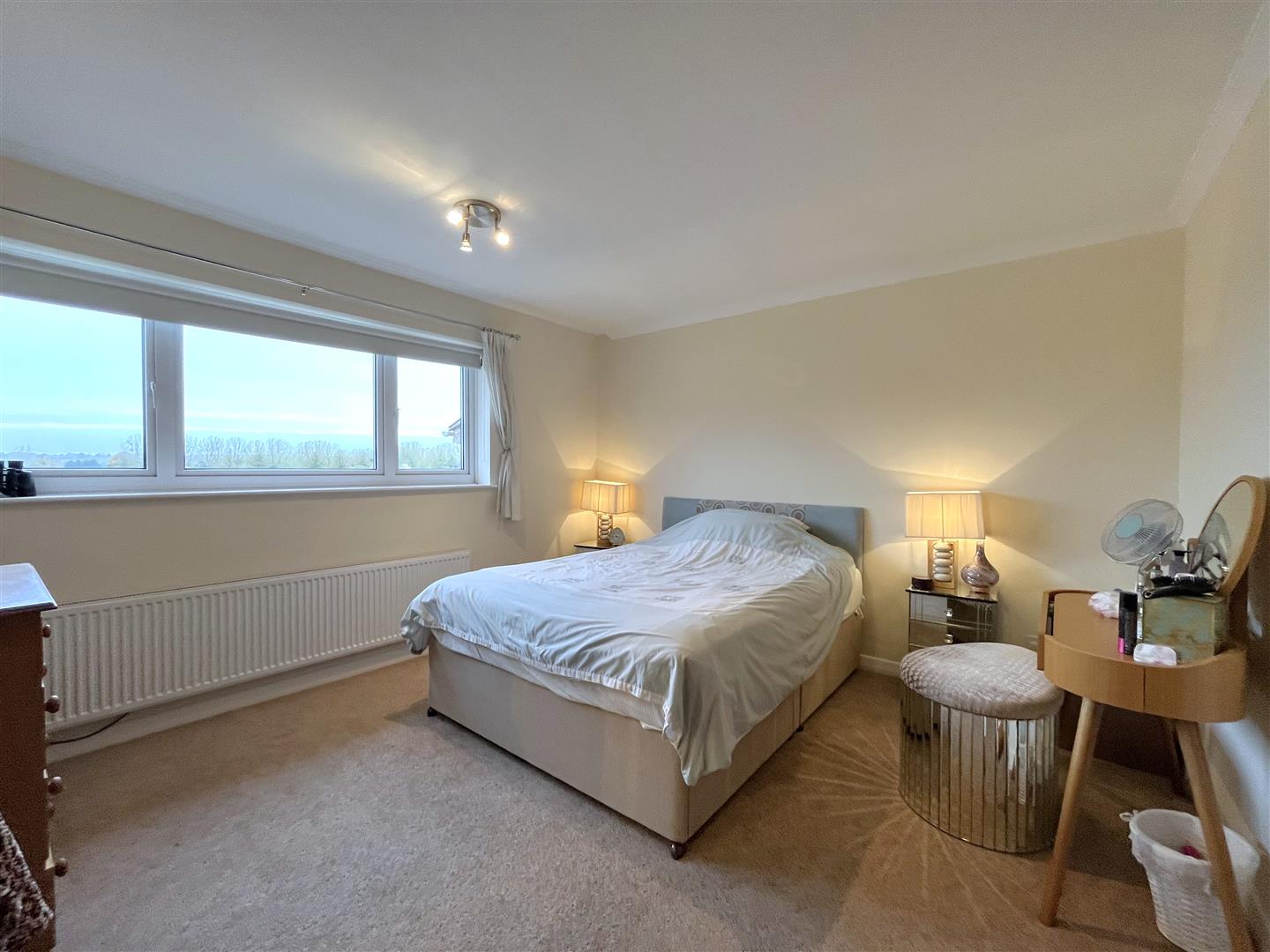 double bedroom located to the front of the house overlooking the race course with double bed, wooden chest of drawers, dressing table and ottoman stool, two mirrored bedside tables and lamps, the bedroom also benefits from inbuilt double wardrobes.