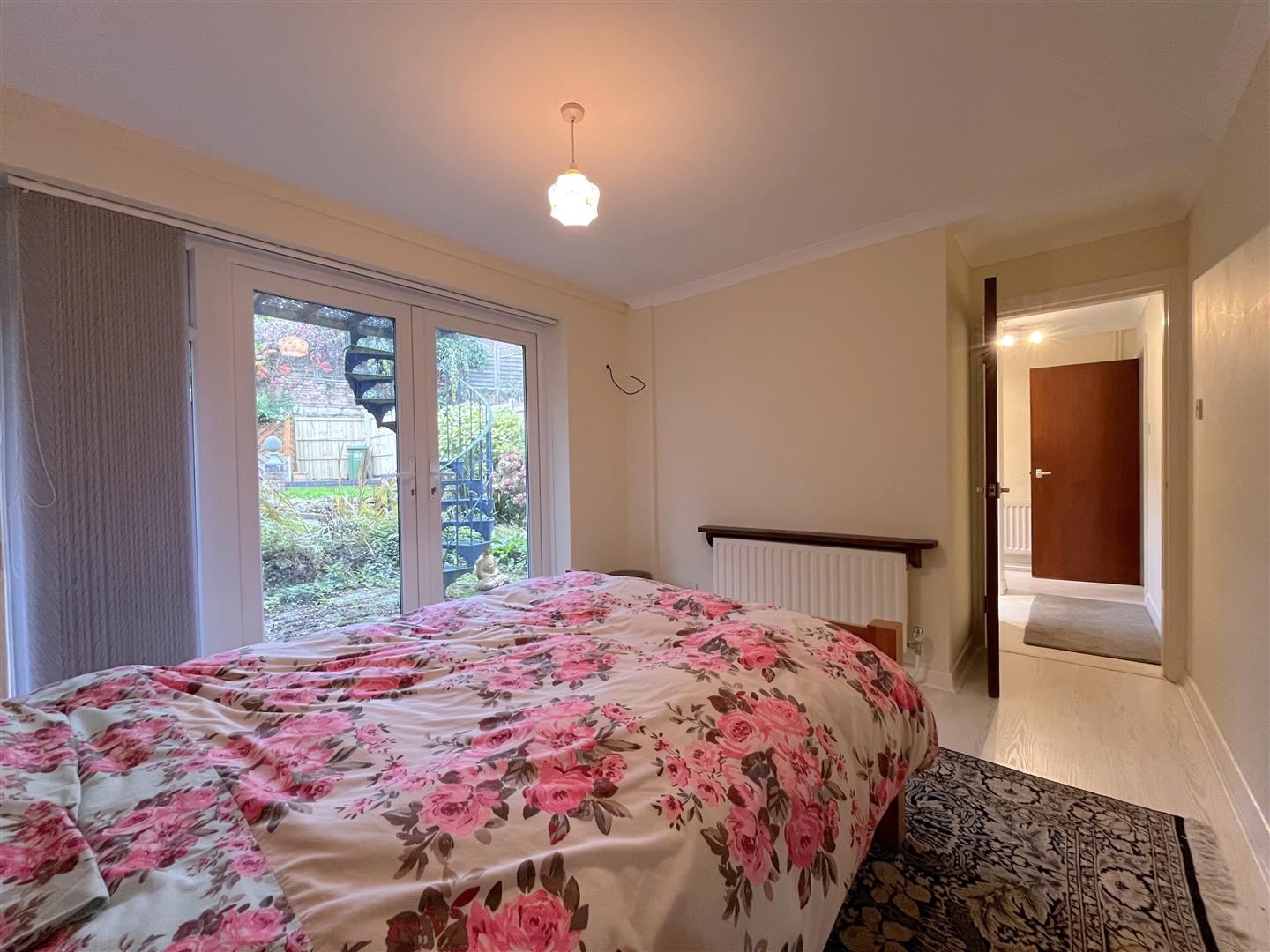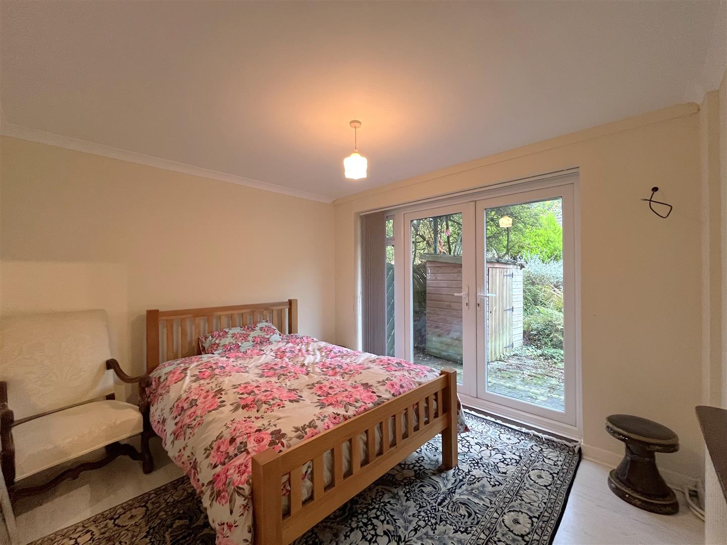 double room with laminate flooring, views and access via patio doors to the garden. Furniture to include solid pine double bed and mattress, chair and side table, shelf over radiator and vertical blinds to windows.