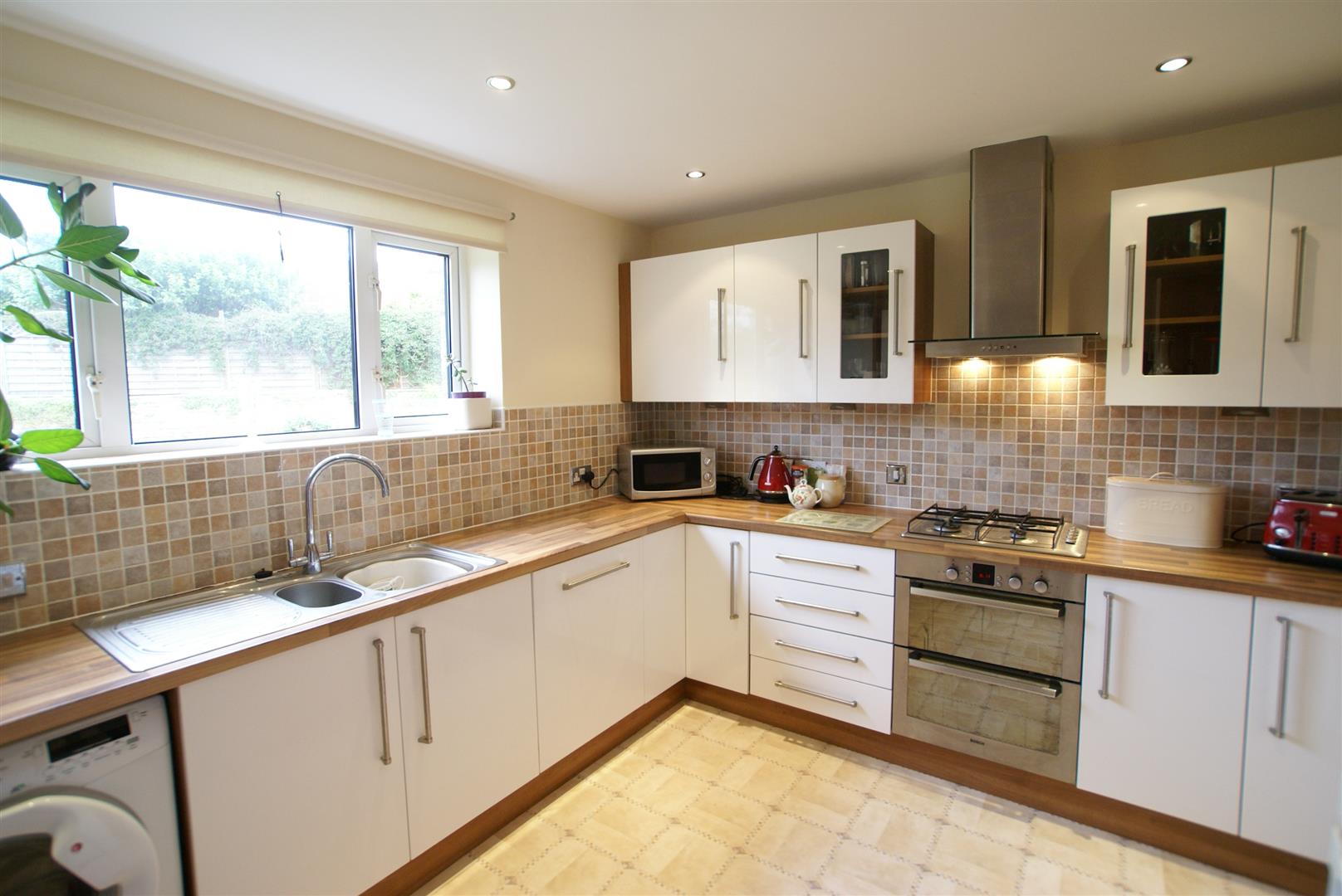 Fully fitted modern kitchen over looking the garden with a range of white wall and base units and wooden counter tops, white goods to include: washing machine, integrated dishwasher, electric oven, gas hob with extractor over and fridge freezer.
