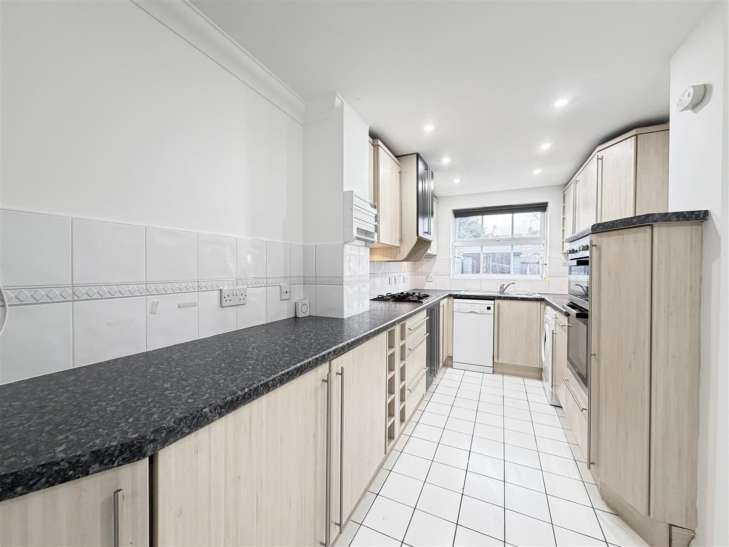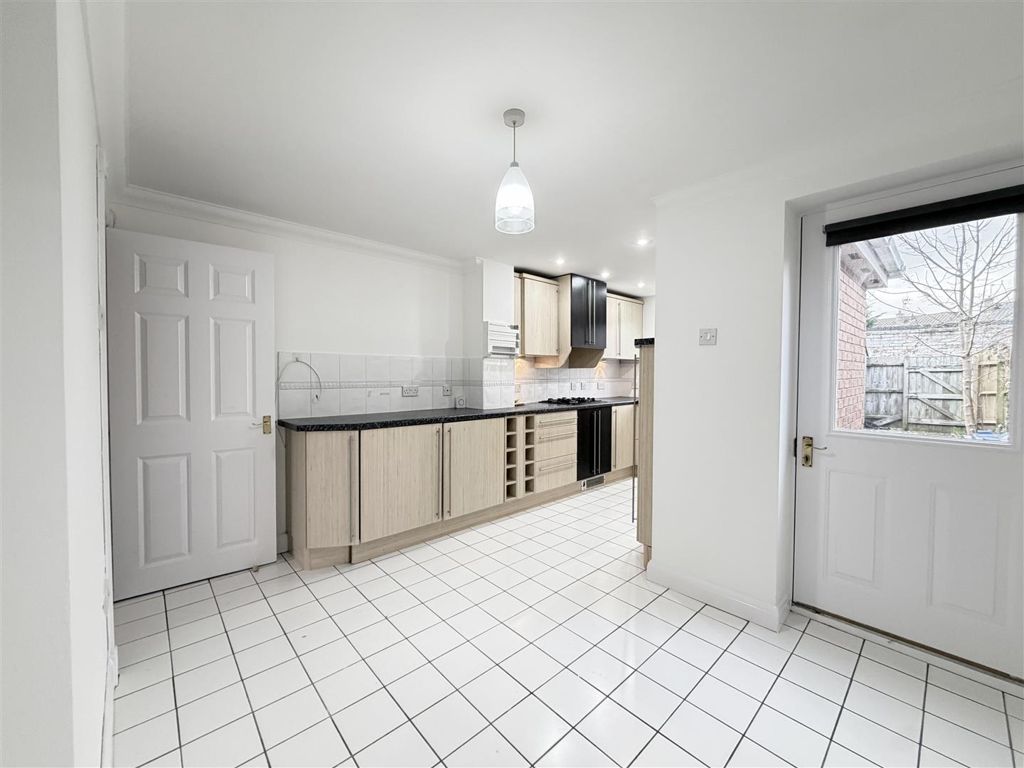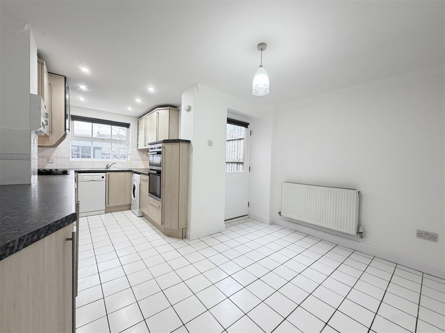 Fully fitted kitchen with range of beech effect floor and wall units. White goods to include electric oven, gas hob with extractor over, washing machine, fridge, freezer, slim line dishwasher. Ceramic tiles to the floor and door to the back garden.