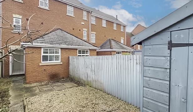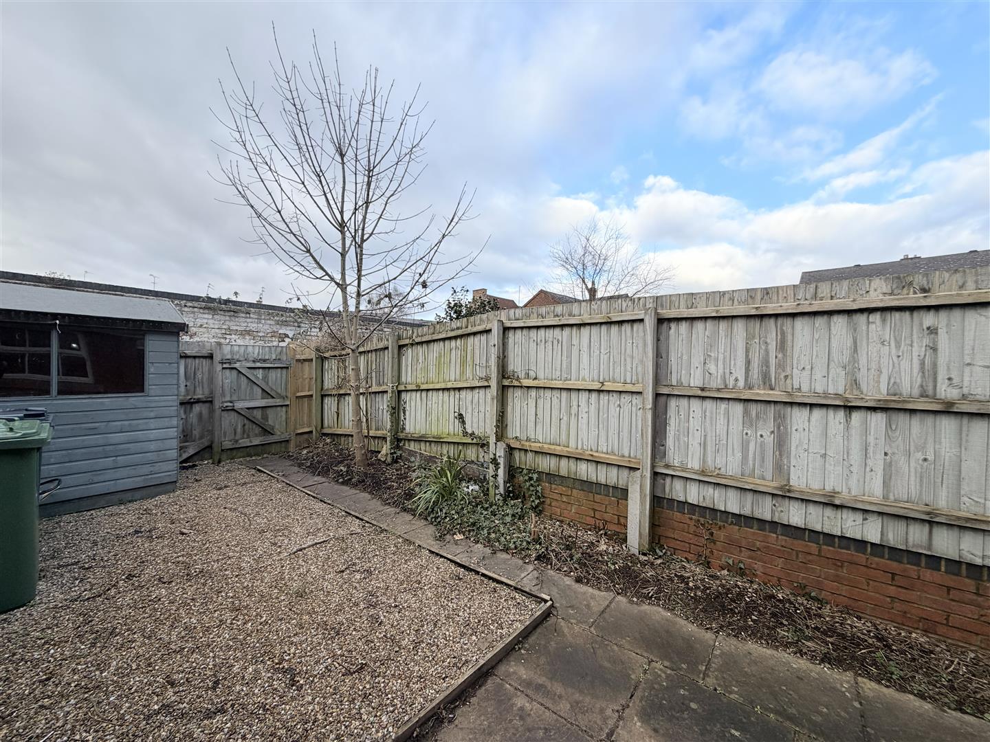 Small enclosed easy to maintain garden with shed.