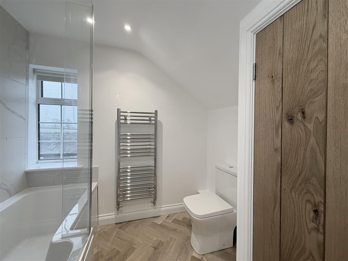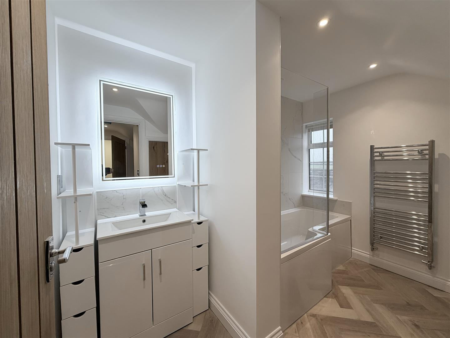 recently refurbished with a white suite, with panelled āPā shaped bath with mixer tap, rain shower with additional adjustable shower over, low-level WC, heated towel rail, sink unit with mirror over and cupboards beneath.
