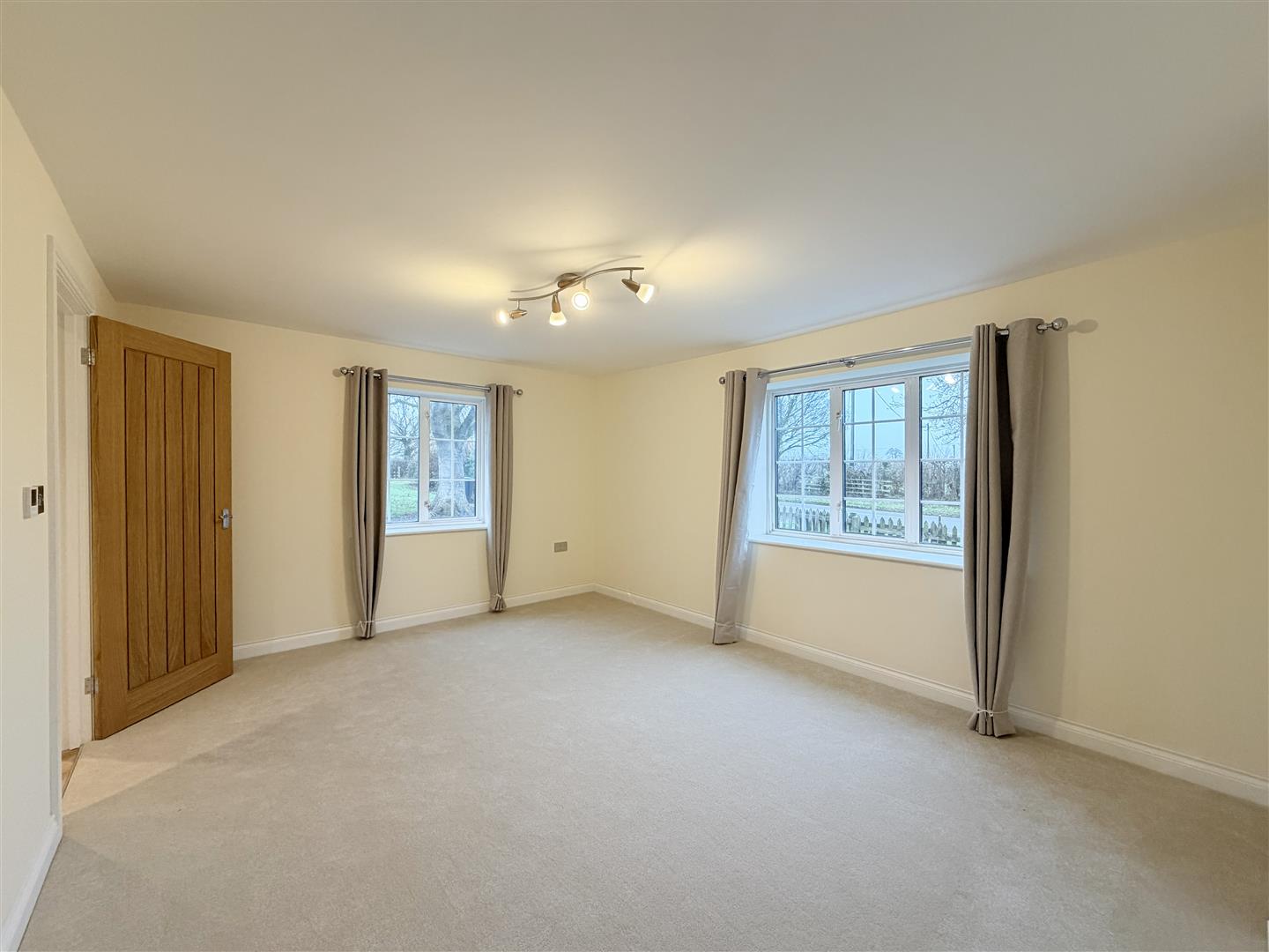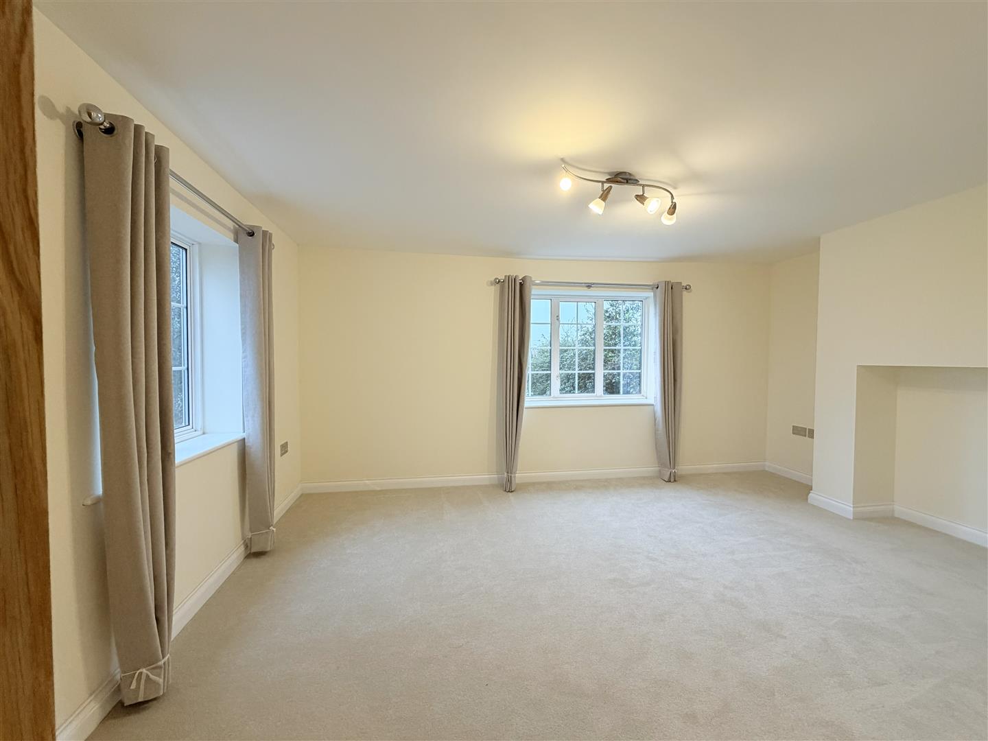 large full width living room with dual aspect double glazed windows and new carpet.