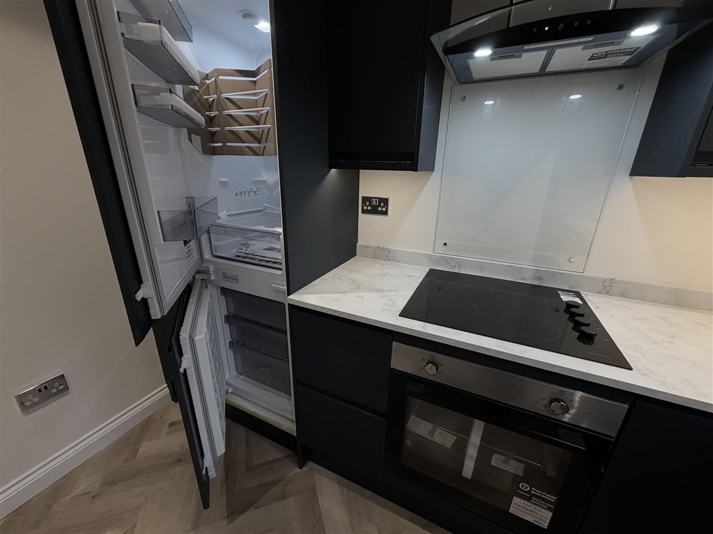 The delightfully reappointed Kitchen has a range of dark blue base units and eyelevel wall cupboards, single drainer sink which is fitted with a mixer tap, four ring electric hob, electric oven, integrated fridge and freezer, cooker hood and double glazed window to the rear.