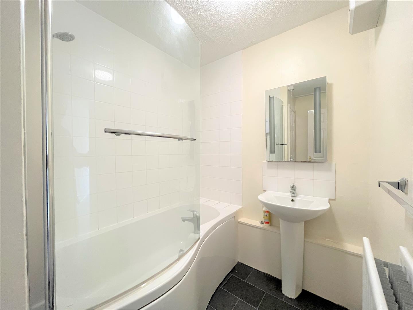 white suite with panelled bath, adjustable shower over and mixer tap. Wash and basin and radiator.