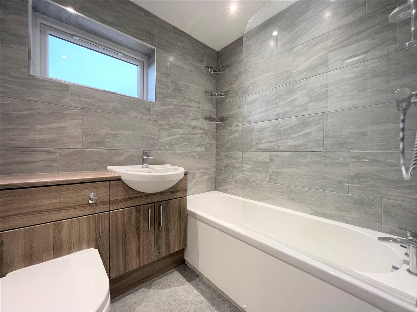 with white suite and panelled bath, having adjustable shower screen over, wash handbasin and low level WC, heated towel rail and obscured double glazed window.