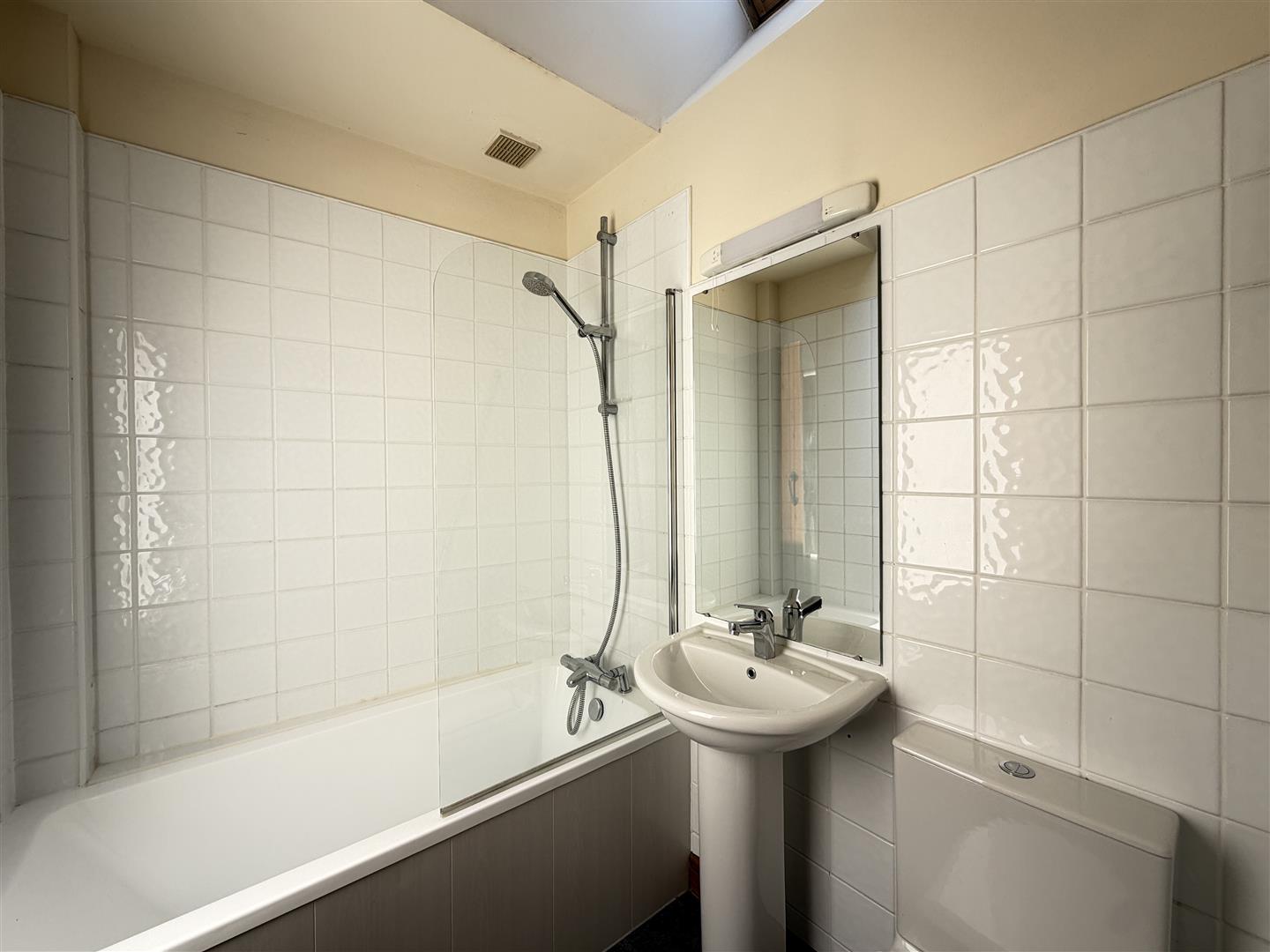 white suite with shower over the bath, low level wc, wash hand basin and sky light.