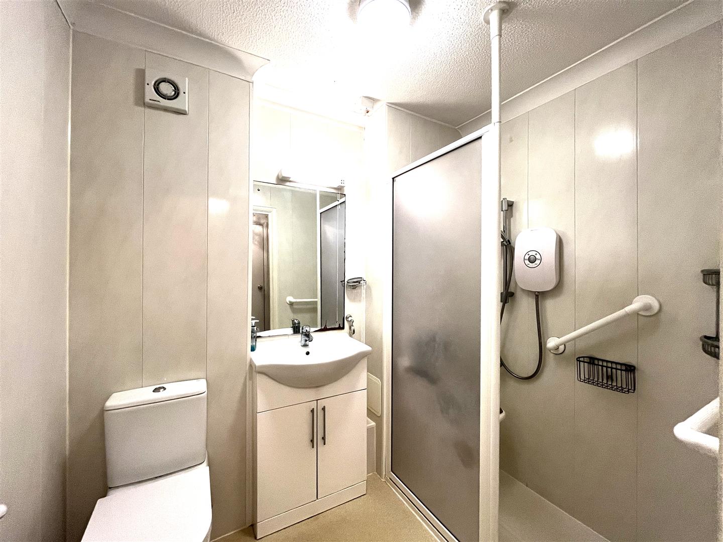 Large walk-in shower cubicle with adjustable shower and pulldown seat, wash hand basin with mixer taps and low-level wc with concealed cistern and handrail, heated towel rail, extractor fan and tiling to full height on all walls.