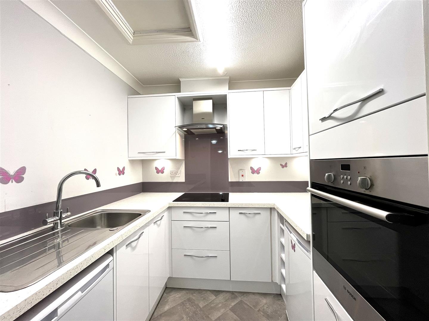 A range of wall and floor units incorporating work surfacing with a single bowl stainless steel sink and a four-ring electric hob. Base units beneath and space that could be used for both a fridge and a separate under counter freezer, cupboard incorporating the Bosch electric oven, range of wall cupboards with unit lighting and cooker filter, and wood effect flooring.