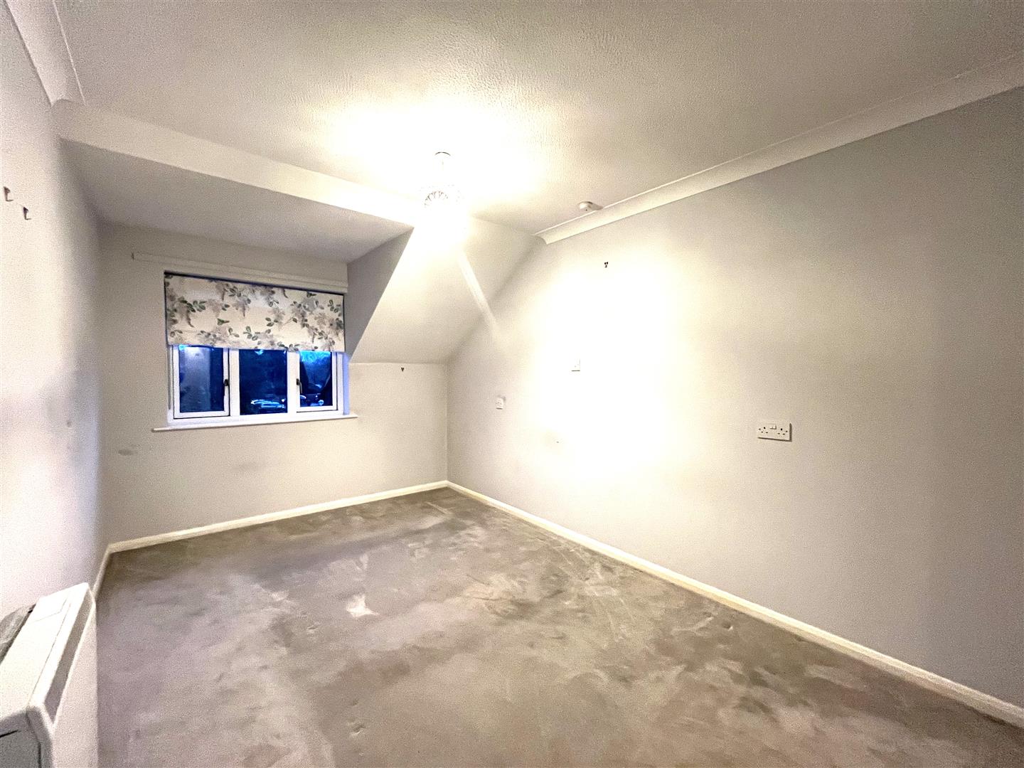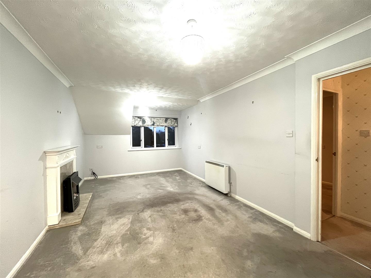 carpeted and with fire setting having electric fire, TV point, electric night storage heater, coved ceiling, and double-glazed windows.