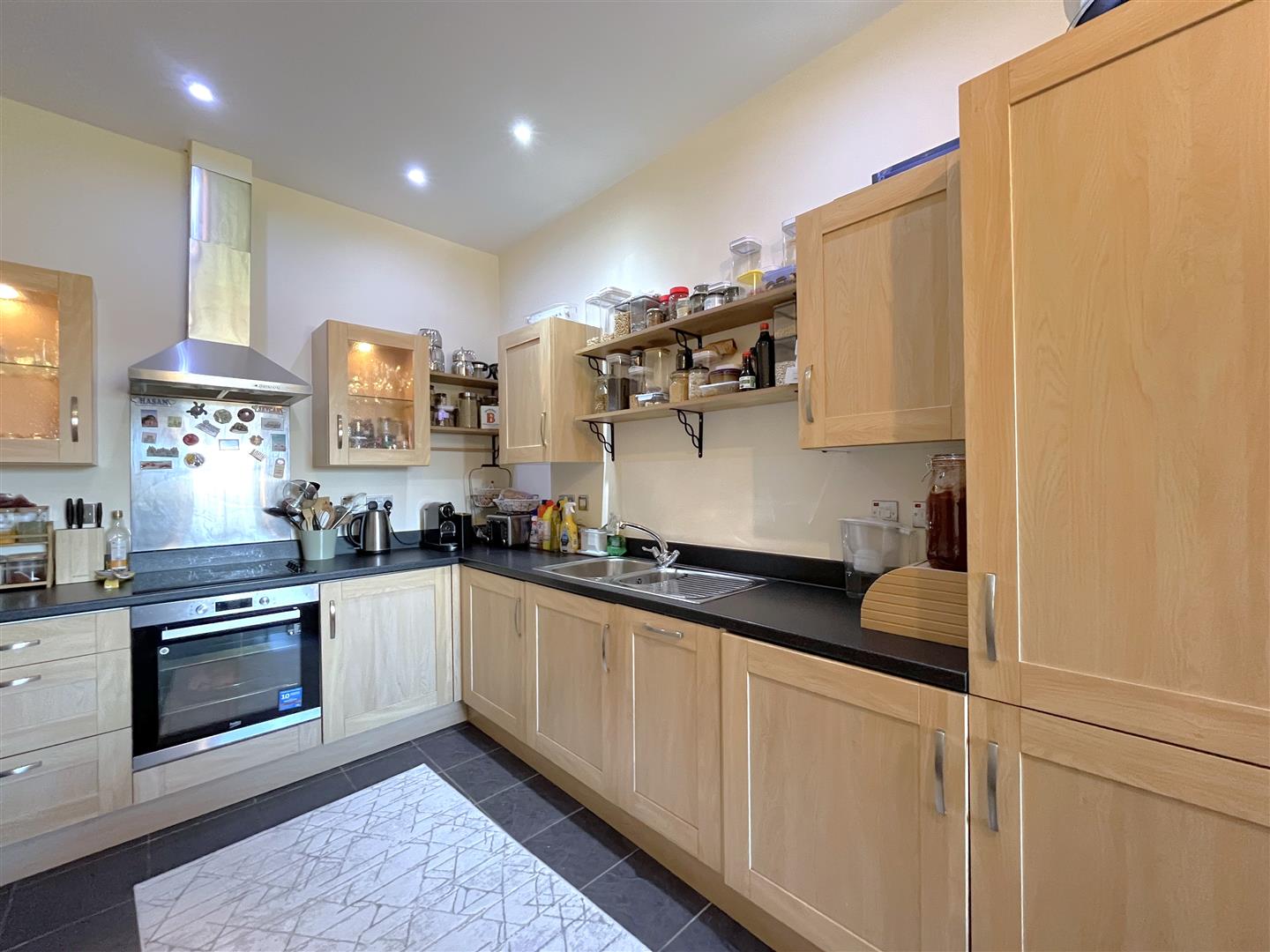 Comprehensive range of units with work surfacing and a one and a quarter bowl, single drainer, stainless steel sink with mixer tap together with a Hotpoint electric hob. Base units incorporate an electric oven, slimline integrated dishwasher, integrated washing machine and tall larder cupboard incorporating the fridge and freezer, tiled floor, eyelevel cupboards, (two of which are illuminated) and cooker hood.