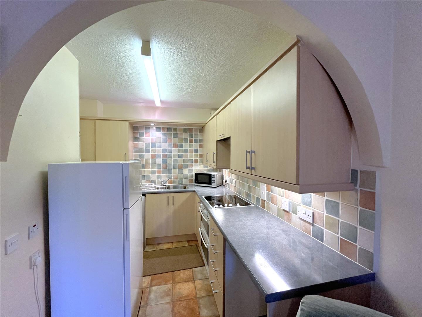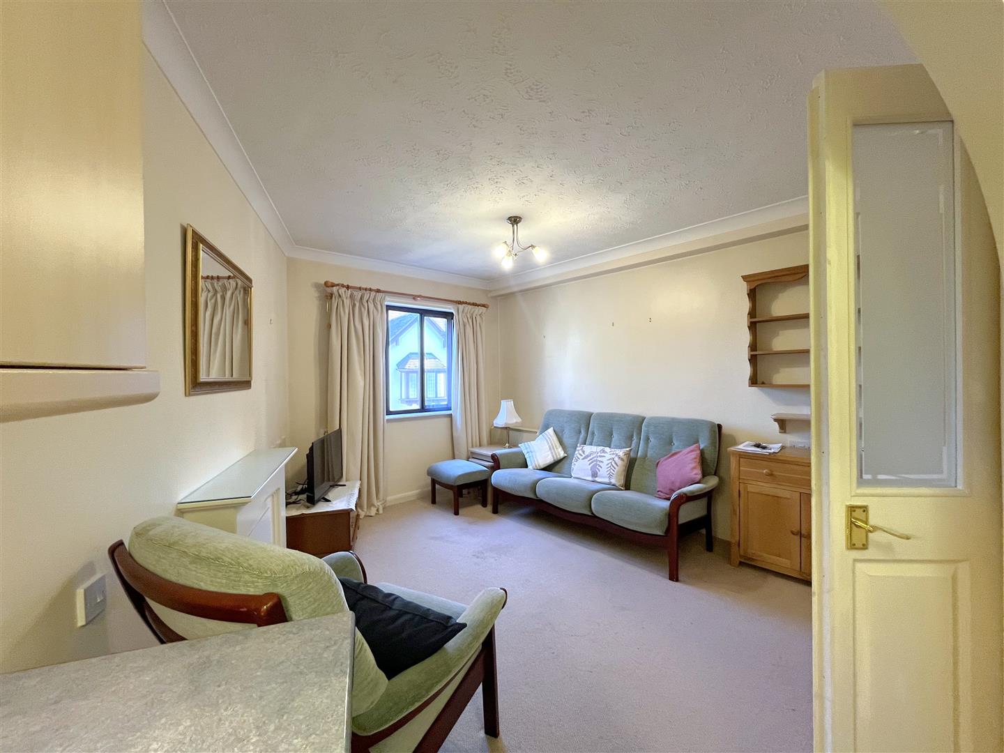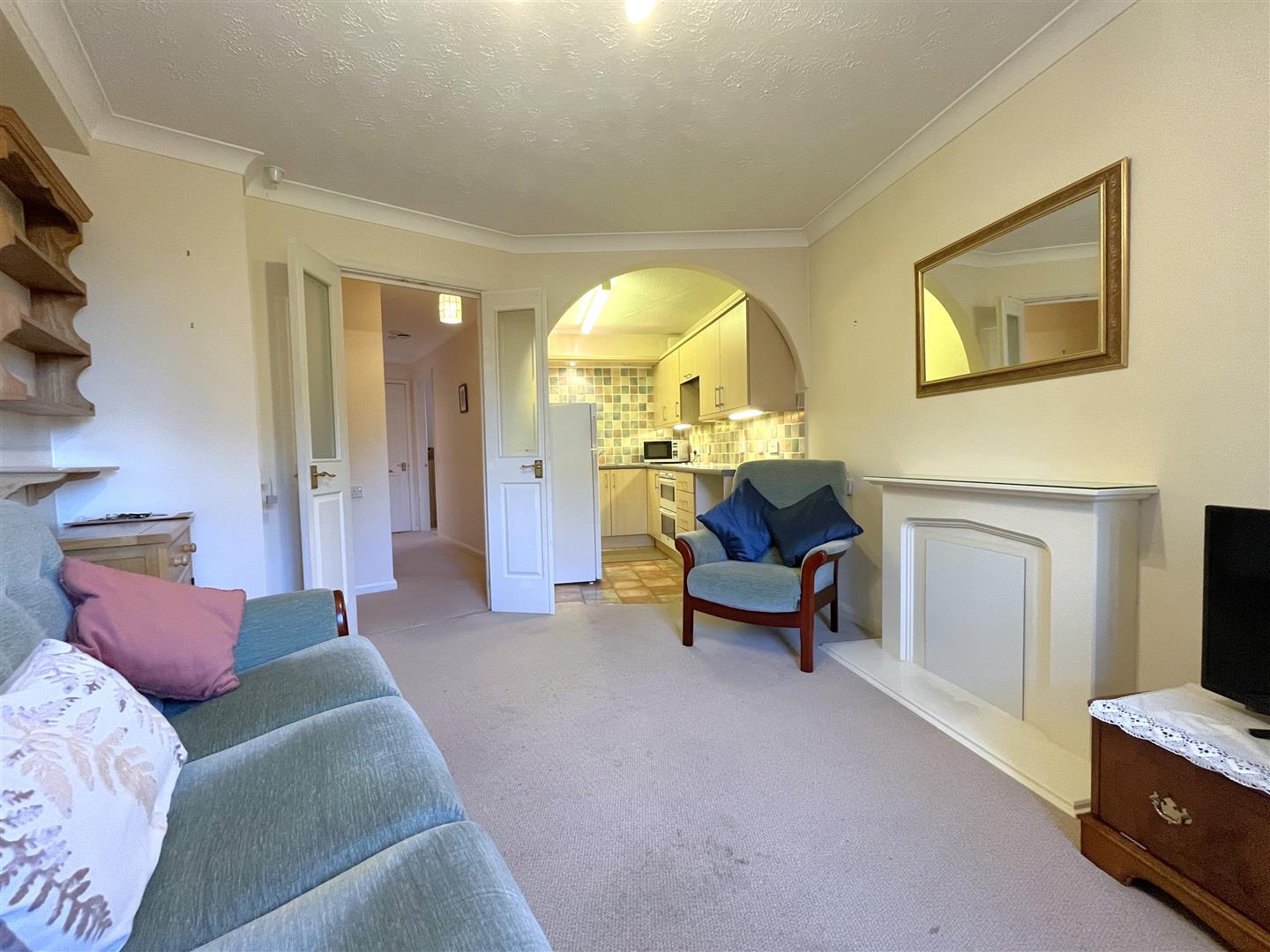 with sealed unit double glazed window having secondary glazing panels overlooking the courtyard and treetop views beyond, electric night storage heater, ornate fire setting, television aerial connection point, satellite point, FMDAB point, coved ceiling and archway through to the