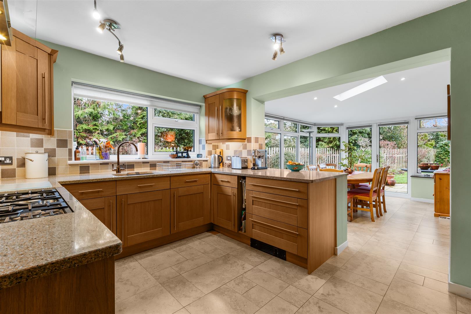 with stone work surfacing extending around the room incorporating the one and a quarter bowl sink unit with mixer tap and drainer and enjoying a comprehensive range of base units and drawers beneath with eye-level wall cupboards above and under unit lighting. Recess for a 1 1/2 sized range cooker with gas point and cooker hood above, tiled splashbacks, two larder cupboards incorporating the fridge and separate freezer, additional larder cupboard to the side with work surfacing and further base units with eyelevel wall cupboards and tiled floor.