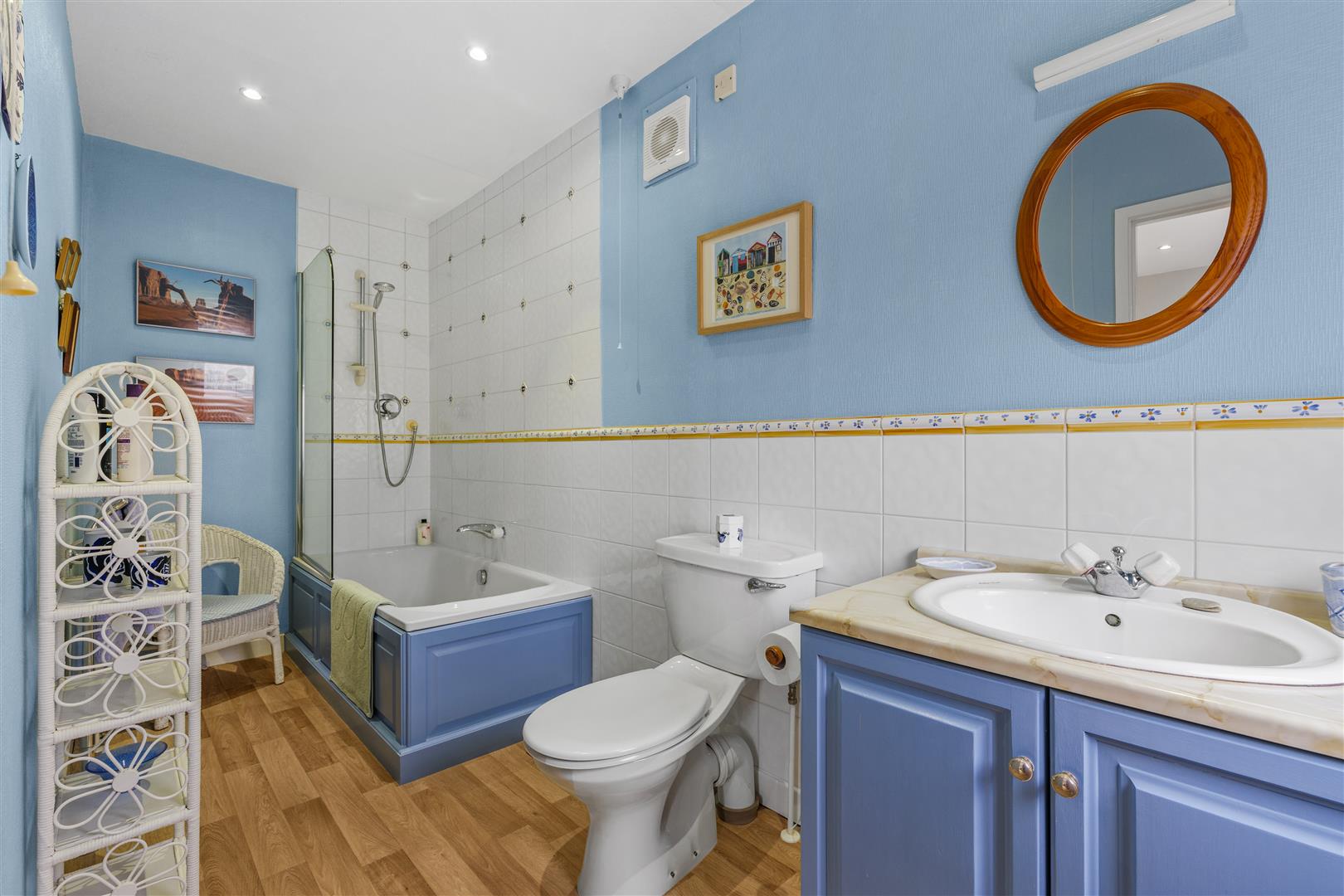 has a four piece suite with bath having mixer tap and mixer tap secured handheld shower, separate shower cubicle with adjustable shower, low-level WC, wash hand basin together with tiled areas and two obscure double glazed windows, heated towel rail and downlighters.
