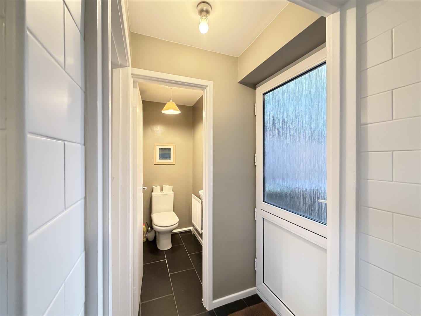 with re-fitted suite having low level WC, wash hand basin with mixer tap, radiator, tiled floor, shaver point with light and obscured double glazed window.