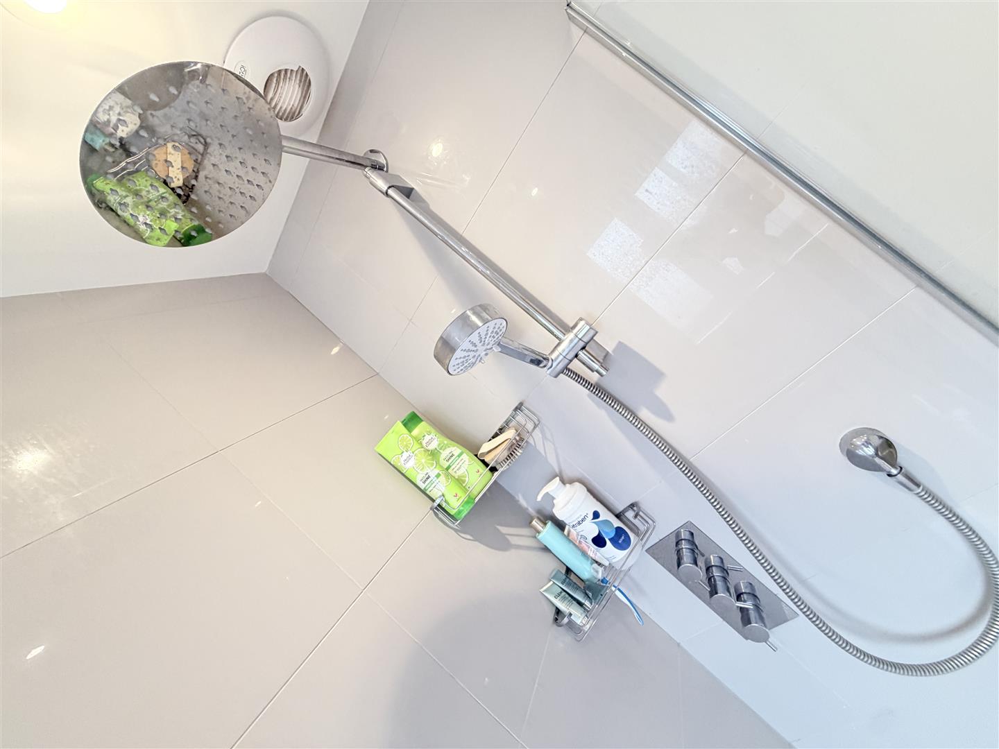 with large double shower cubicle, fully tiled with adjustable shower, wash hand basin with cupboard beneath and mixer tap and low level WC with concealed cistern, display shelf, splashbacks, downlighters and heated towel rail together with LTV matching flooring.
