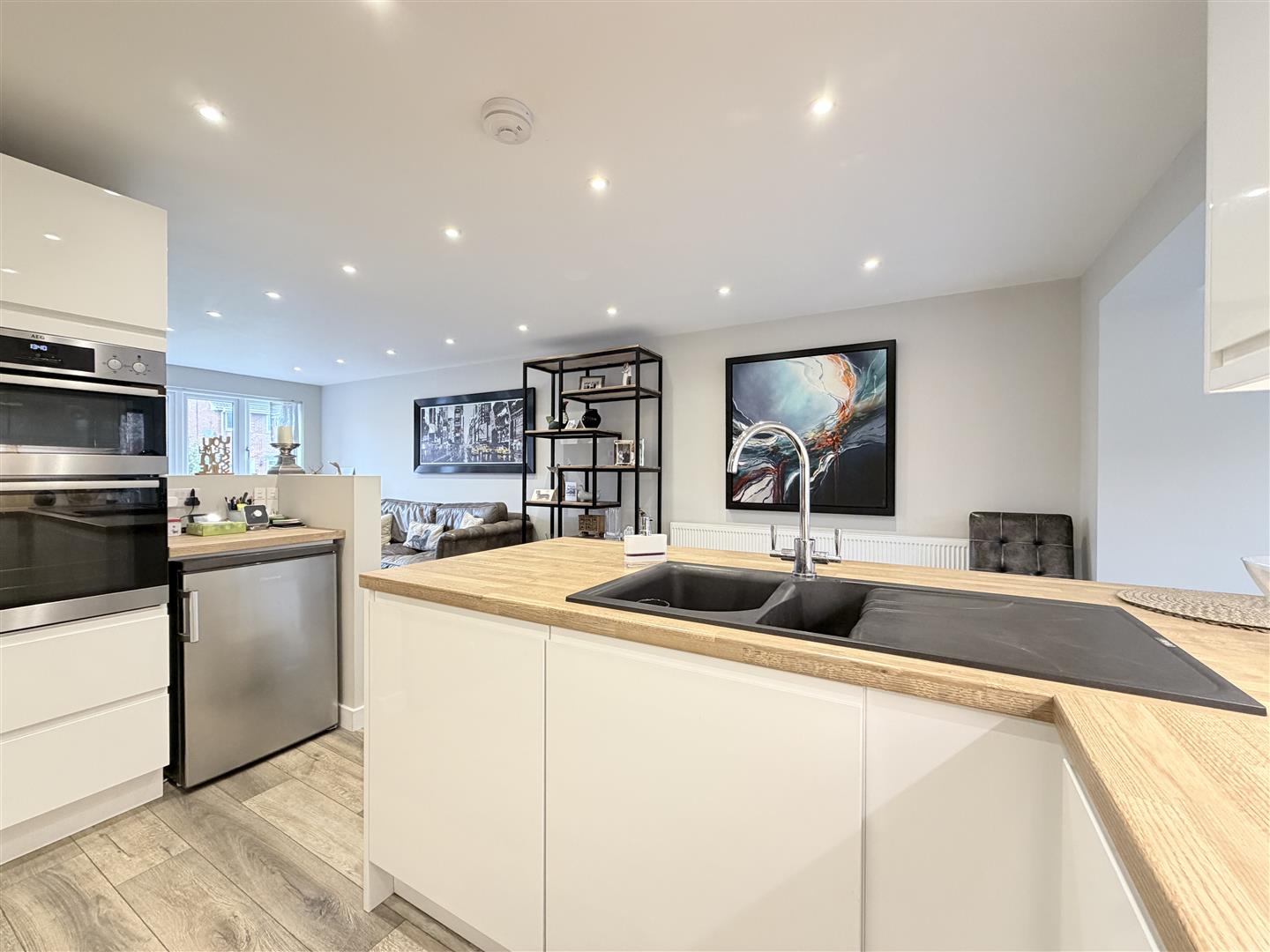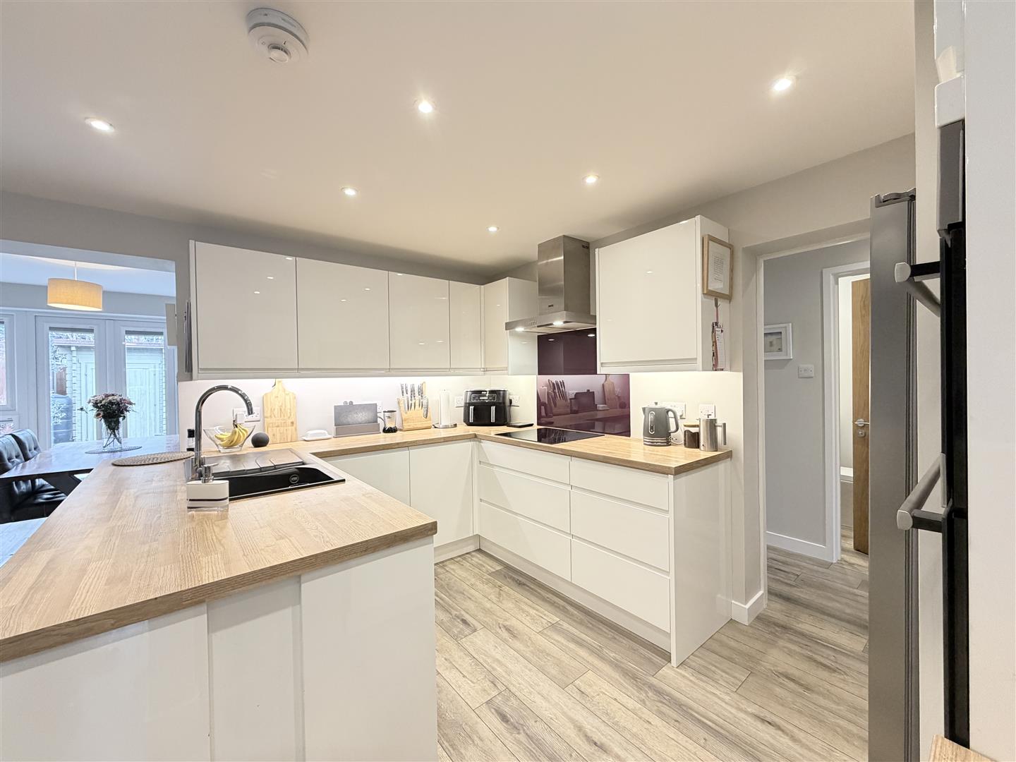 with radiator, down lighters and an attractive "C" shaped range of butchers block style wood affect work surfacing incorporating the four ring electric hob and one and a quarter single drainer sink unit with mixer tap. Comprehensive range of cupboards and drawers beneath and recess suitable for an American style fridge freezer. Tall larder cupboard incorporating the AEG double oven and grill. Work surfacing to the side with space for appliance under. The kitchen has an integrated Neff full sized dishwasher and slide out bin store, also incorporated is concealed housing for the washing machine with plumbing, range of eye-level wall cupboards and Zanussi cooker hood together with ceiling fitted down lighters and under unit lighting.