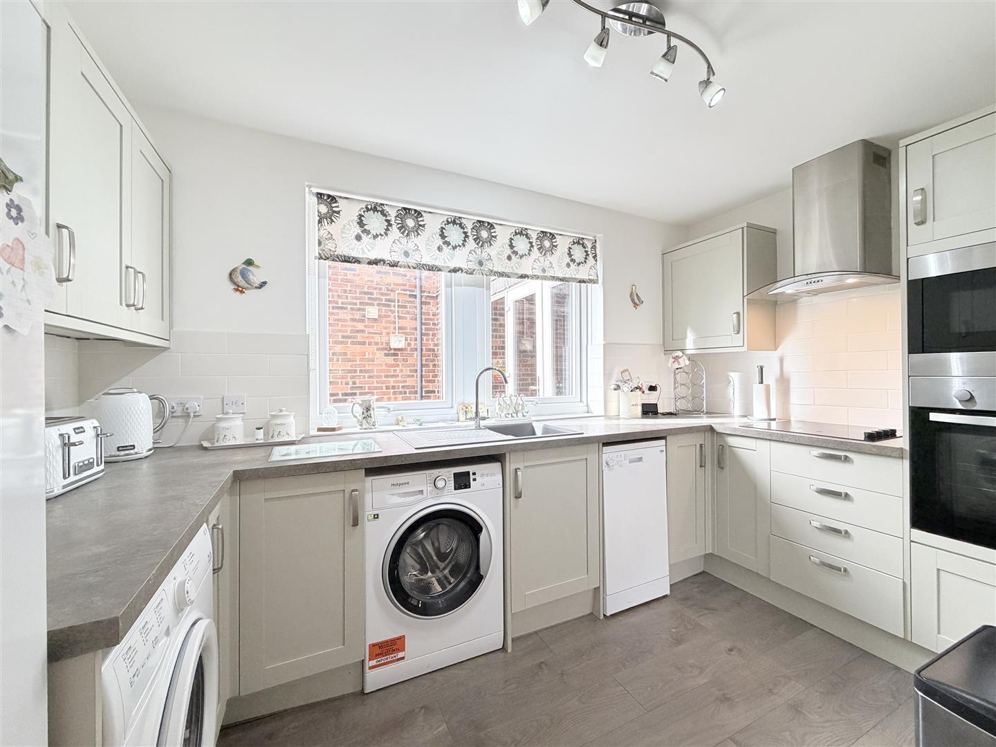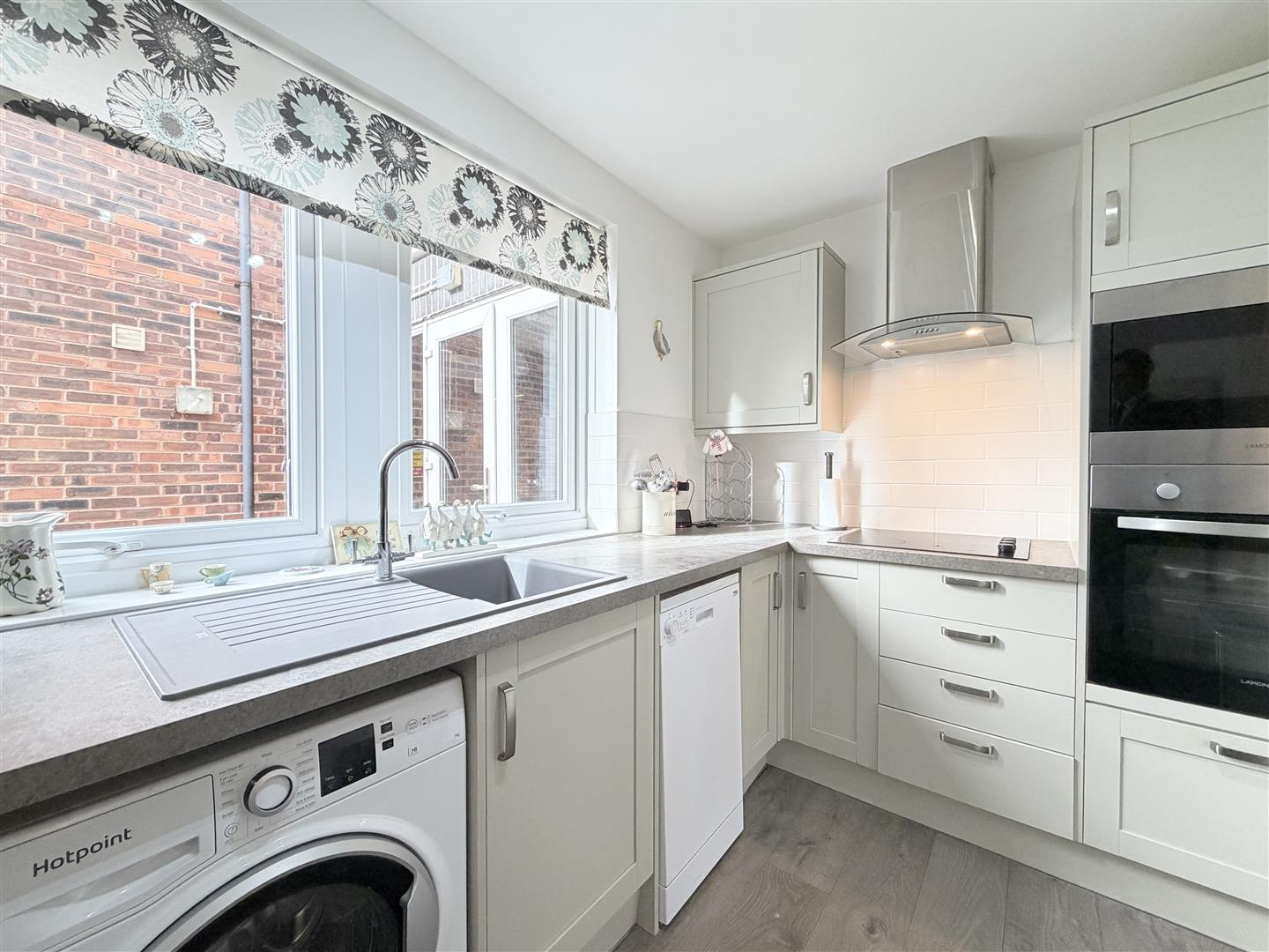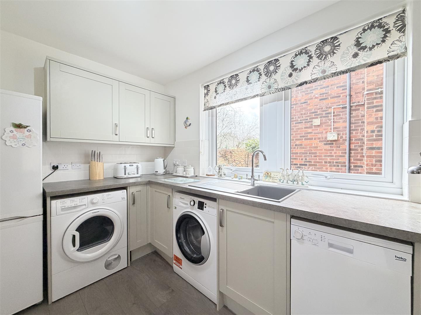 has a modern range of contemporary square edge work surfacing extending around the room incorporating an electric four ring hob and a single drainer sink unit with mixer tap. Range of base units and drawers beneath leaving space for a slimline dishwasher, washing machine, and separate tumble dryer. Space suitable for a larder style fridge freezer if desired, range of eyelevel wall cupboards together with cooker hood. Tall larder cupboard incorporating the electric oven and separate microwave. Double glazed windows, and timber effect floor.