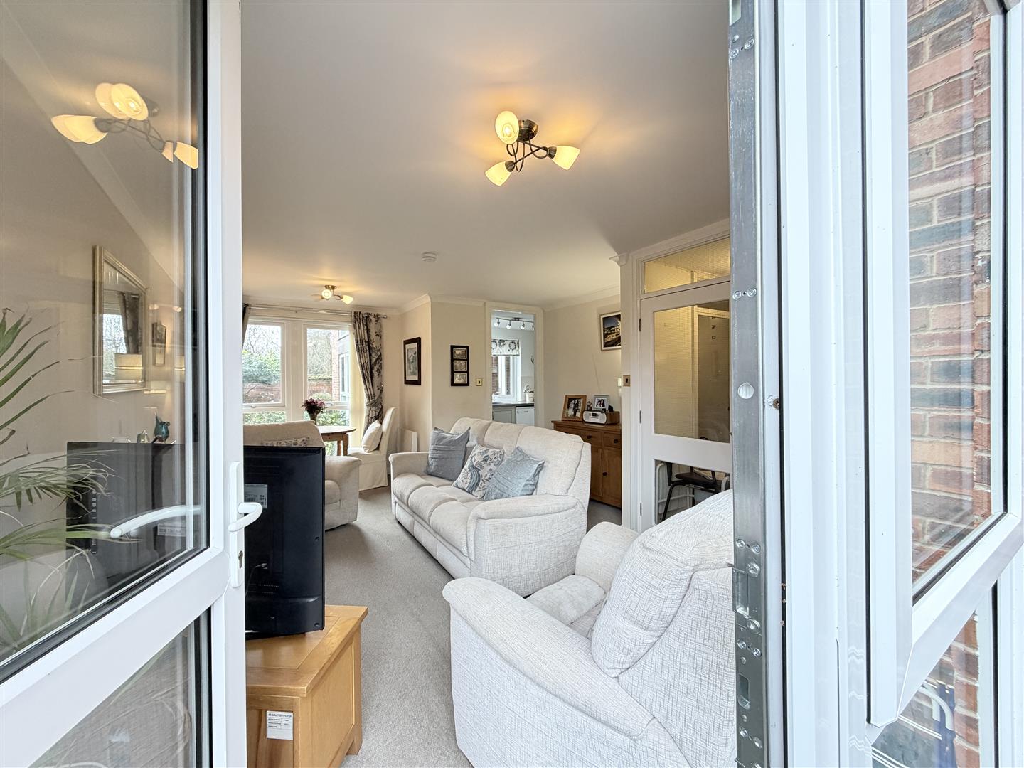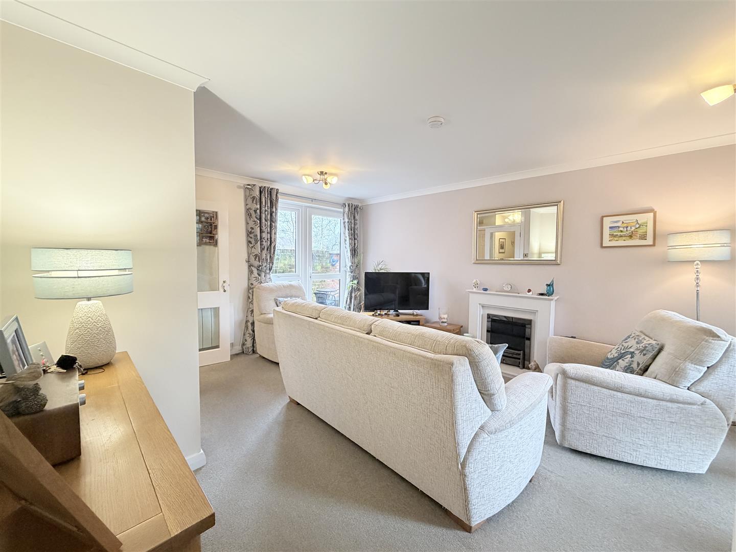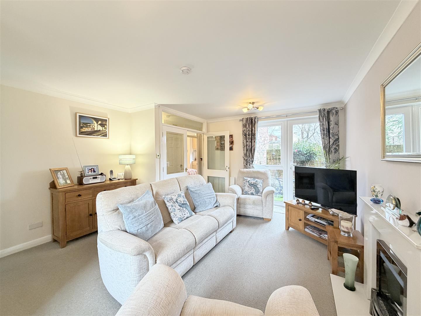 This delightful room has an electric central fire setting with hearth and surround, coved ceiling, two electric panel heaters, double glazed window to the communal gardens and double glazed window with front door opening to a patio area.