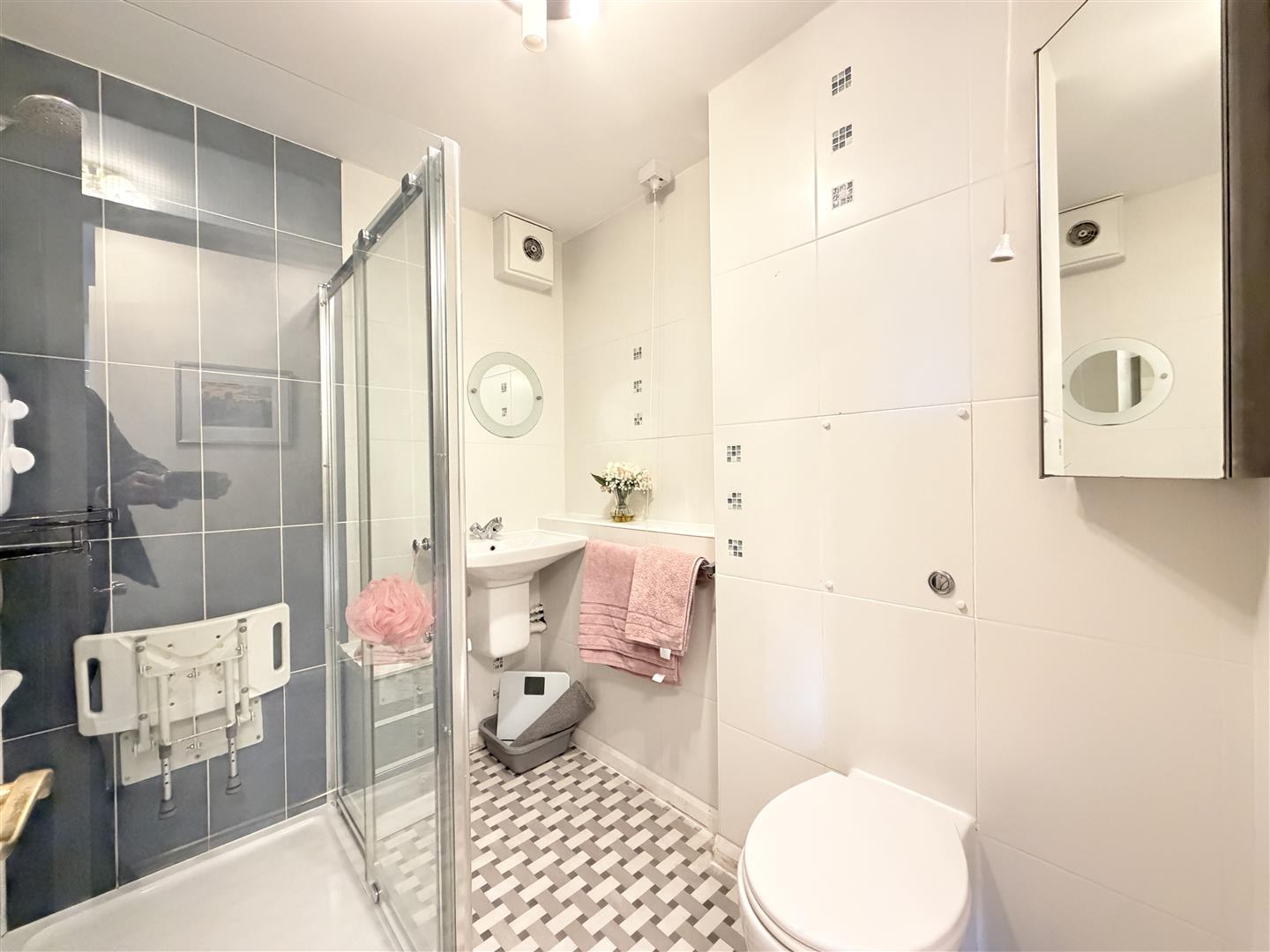 has a walk-in shower cubicle with a Triton adjustable shower, low level WC with concealed cistern, wash hand basin with mixer tap, extractor fan, tiling to full height on all walls, and towel rail.