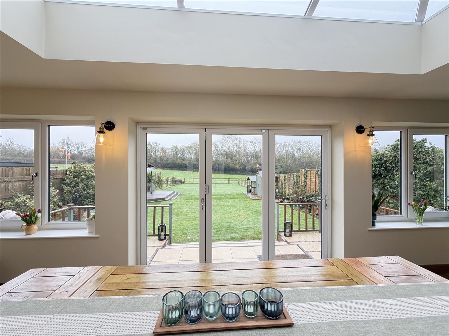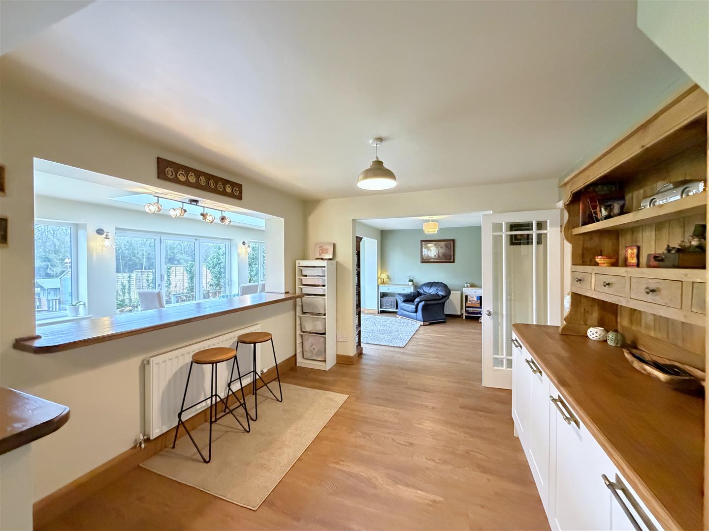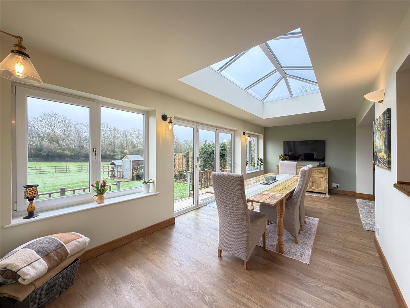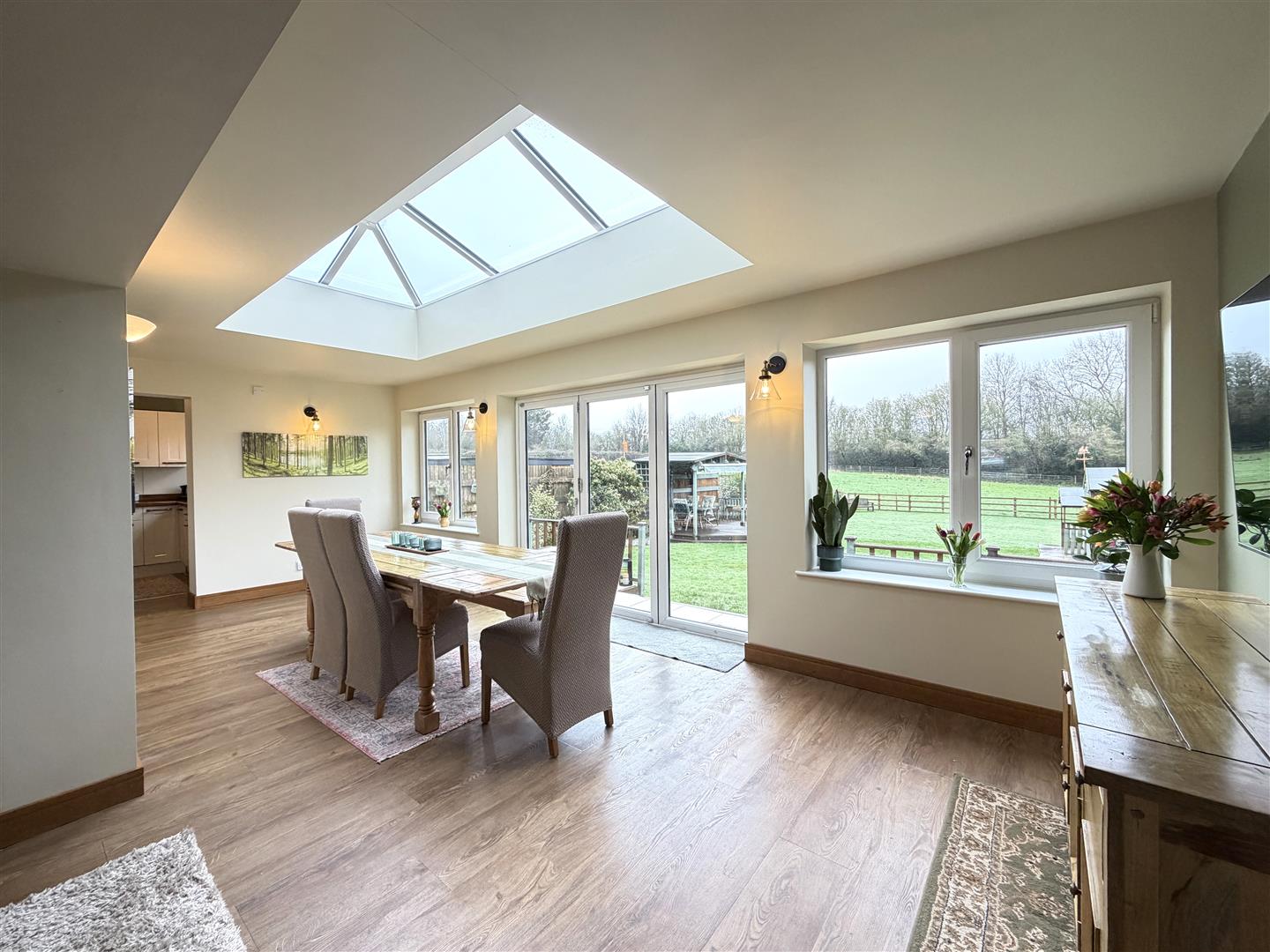 with wood effect flooring and under floor heating, radiator, impressive cathedral style roof light affording lots of light, this room enjoys sliding bi-fold double glazed patio doors and windows to either side opening onto the patio and garden beyond, and door to under stairs storage cupboard.