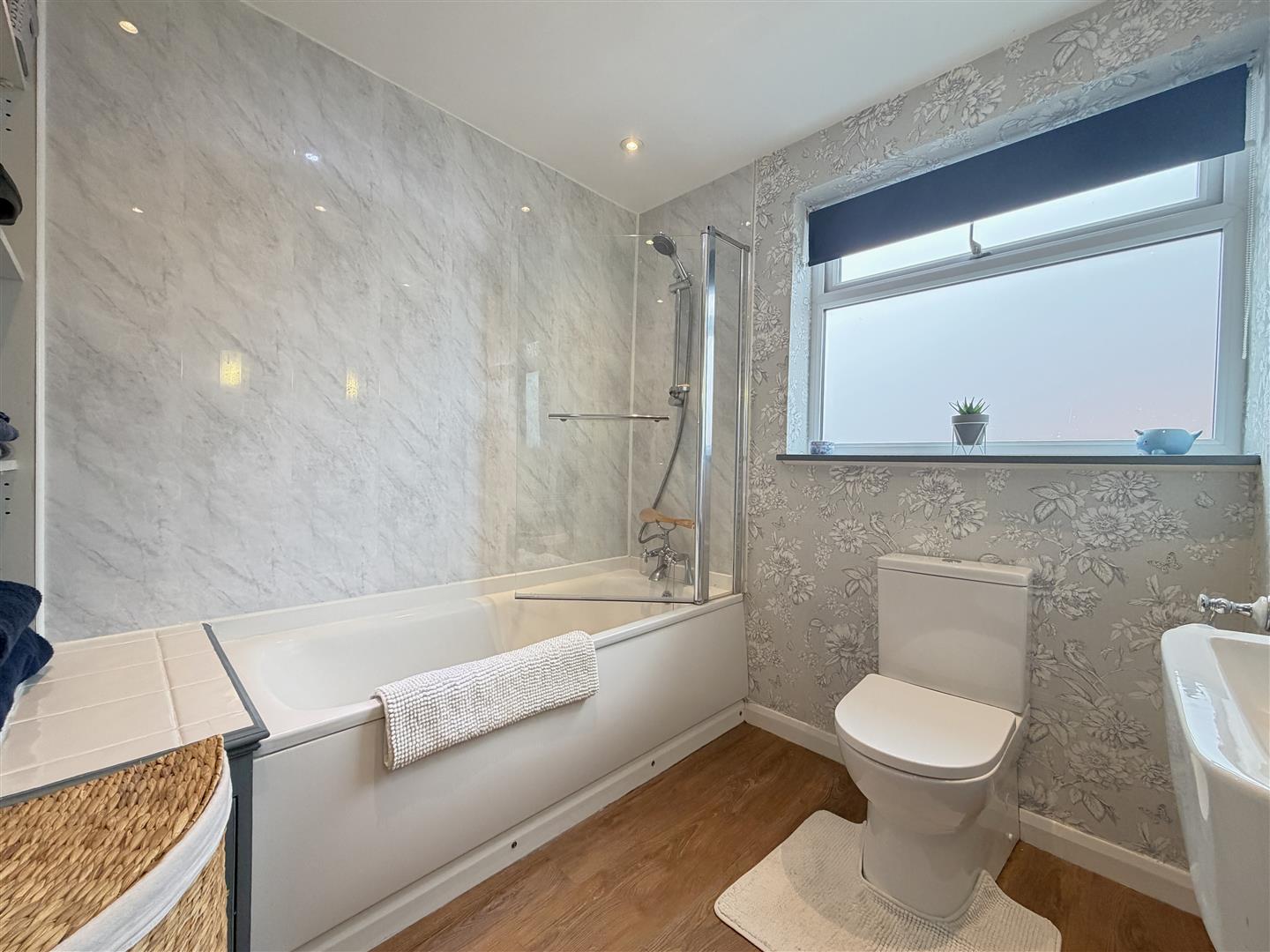 has a white suite with panel bath having a mixer tap and tap secured adjustable shower over with screen, low-level WC, wash hand basin with mixer tap and cupboard beneath, downlighters, wiring for two wall lights and heated towel rail.