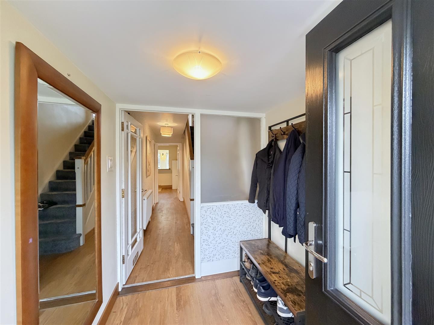Double glazed front door with matching side windows opens into a large entrance porch with under floor heating.